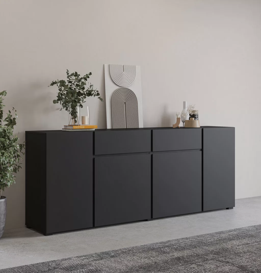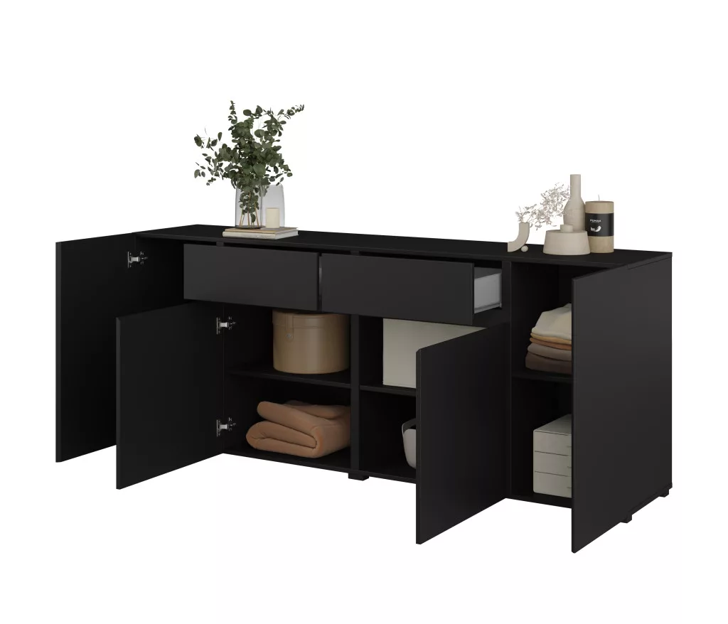 A komód kombinált elrendezésének köszönhetően több különálló tárolórésszel rendelkezik: zárt szekrények és tágas fiókok segítik a rendszerezést, így minden kéznél van, mégis rendezett marad a tér. Ideális ruhák, dokumentumok, háztartási eszközök vagy nappaliban média-kiegészítők tárolására is.