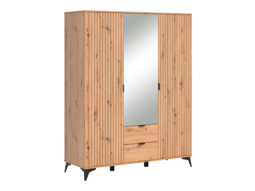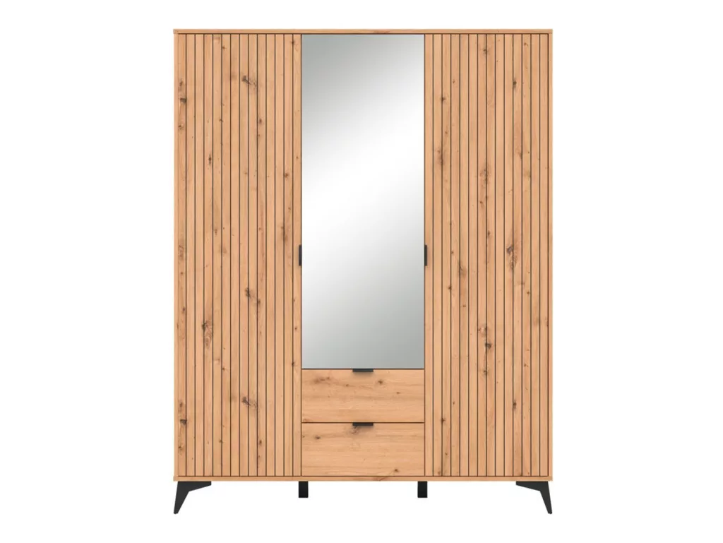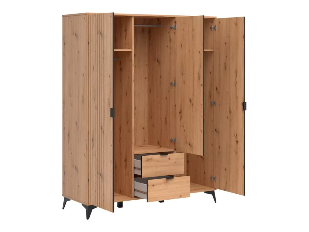 A Lamea háromajtós ruhásszekrény egy elegáns és funkcionális bútordarab, amely tökéletesen mutat egy hálószobában vagy egy gardróbszobában. Természetes, kézműves tölgyfa felülete és jellegzetes faerezete otthonos hangulatot teremt, míg a díszes marások dinamizmust kölcsönöznek. A karcsú fekete lábak és fogantyúk hangsúlyozzák a kollekció modern jellegét.