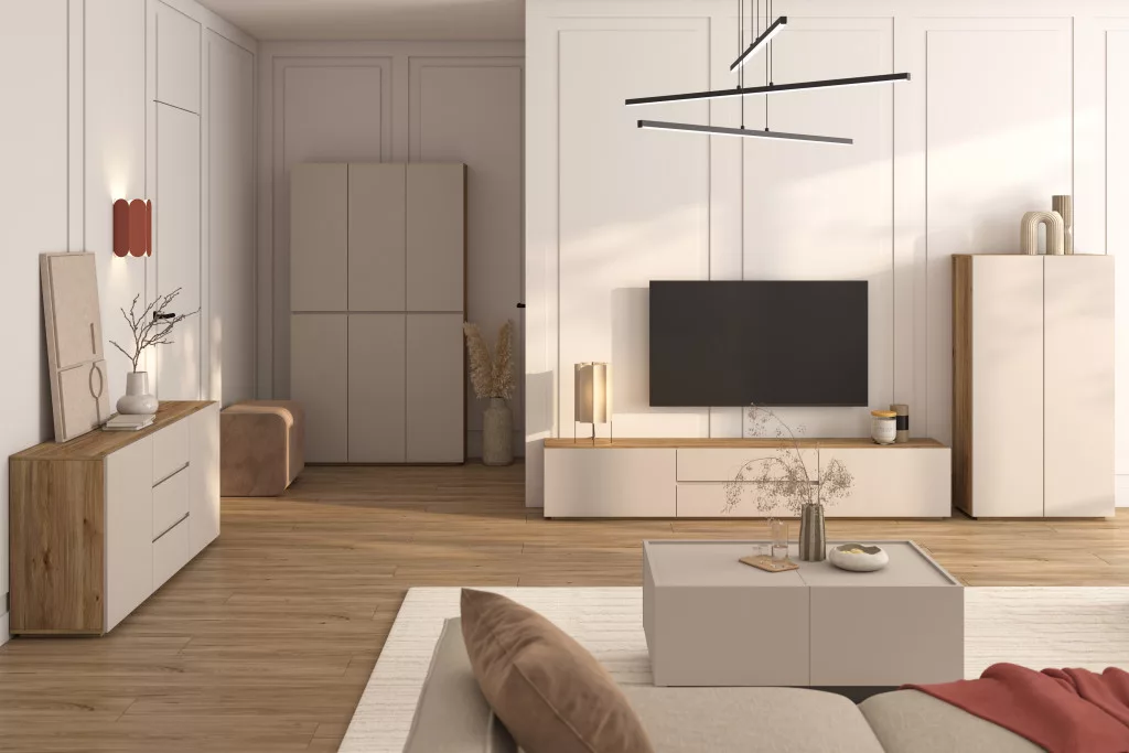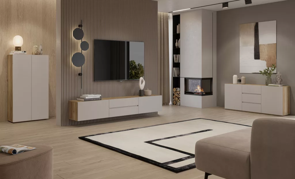 Ez a letisztult, elegáns TV állvány tökéletes választás a modern nappalik központi elemének. A természetes hatású mauvella tölgy és a finom kasmír szín kombinációja harmonikus, világos összhatást teremt, amely könnyedén illeszkedik különböző enteriőr stílusokhoz.