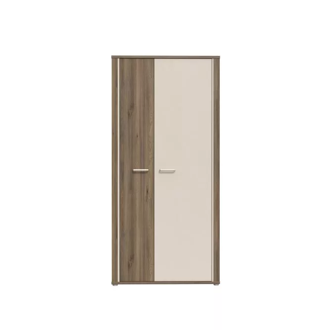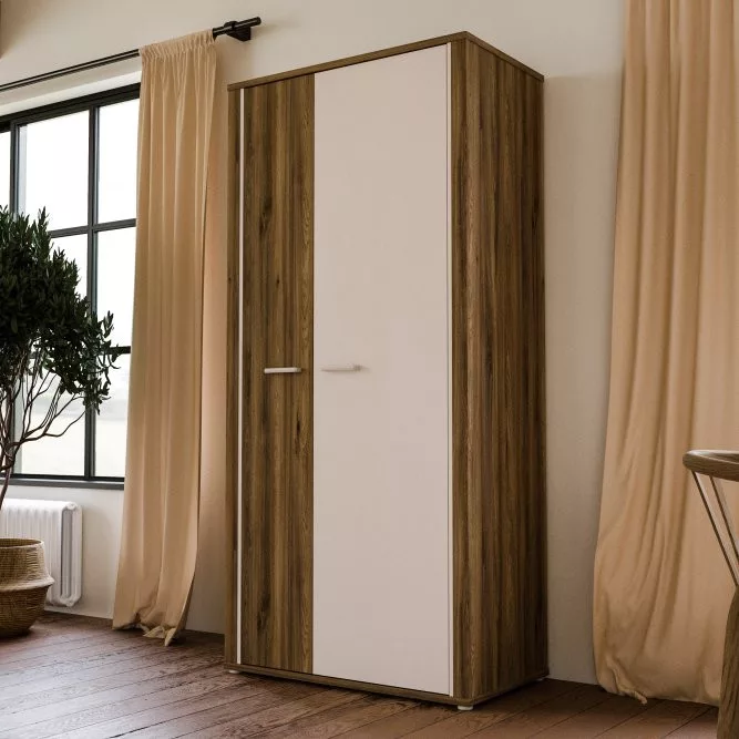 Letisztult stílus és praktikus belső elrendezés jellemzi ezt a kétszárnyú gardróbszekrényt. A meleg fahatású korpusz és az elegáns, világos ajtólapok harmonikus kontrasztot alkotnak, így könnyedén illeszkedik modern és klasszikus enteriőrbe is. A 198,3 cm-es magasság bőséges tárolóhelyet biztosít, a belső polcok és a vállfatartó rúd pedig segít rendszerezetten tárolni a ruhákat. Ideális választás hálószobába vagy vendégszobába is.