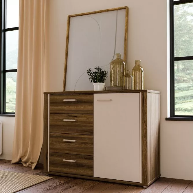 A Demetrios modern stílusú komód tökéletes olyan helyiségekbe, mint a nappali vagy az étkező. A szekrények és fiókok bőséges tárolóhelyet biztosítanak. A fiókokban kisebb tárgyak és dokumentumok tárolhatók, míg a szekrényekben nagyobb tárgyak rejthetők. A teteje remek hely TV-nek, fényképek vagy kedvenc dekorációk kiállítására. A komód egységes elrendezést alkot a Demetrios kollekció többi bútorával.