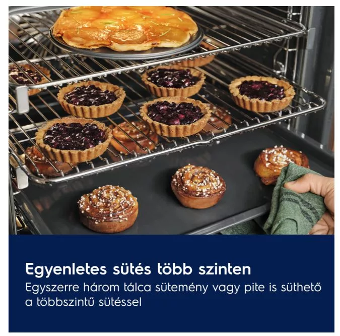 Az extra körfűtőszál segítségével a hő egyenletesen kering a tepsik között is.