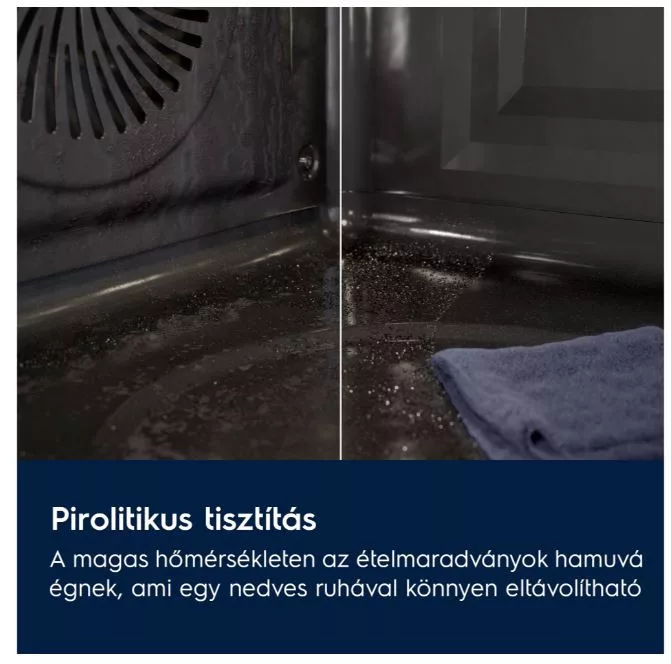 A pirolitikus tisztítási funkció magas hőmérsékleten hamuvá égeti a zsírt és az ételmaradékot, melyeket könnyedén kitörölhet egy nedves ruhával.