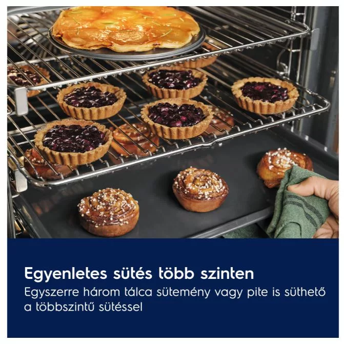 A Többszintű sütés funkcióval a harmadik fűtőelemnek köszönhetően több szinten is egyenletesen süthet. Tökéletes három tepsi süti vagy pite egyidejű elkészítéséhez.