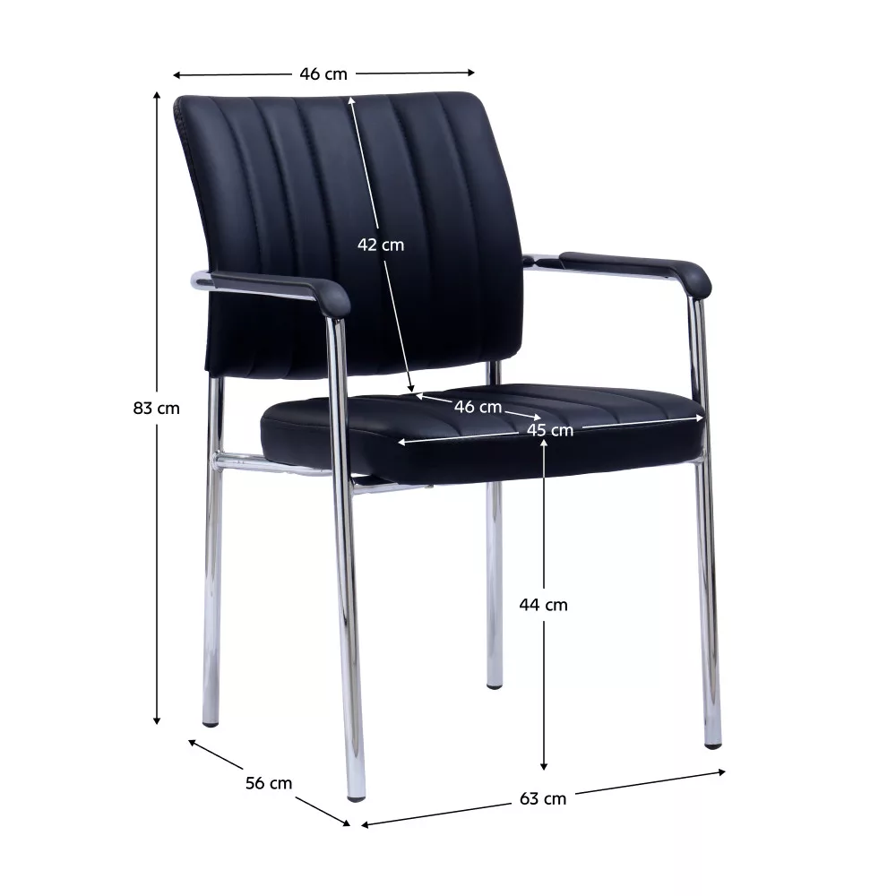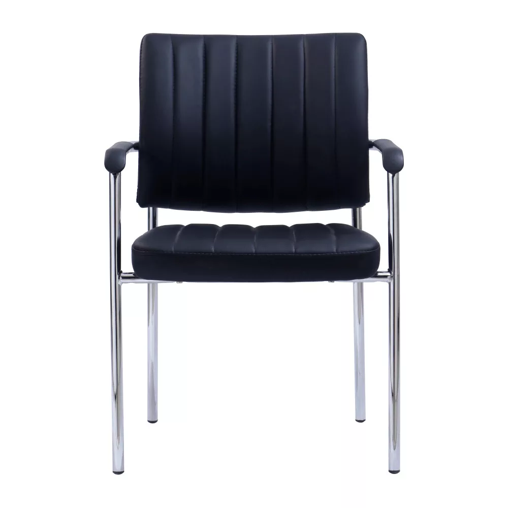Az elegáns FLORIN tárgygalószék fekete ekobőrből készült, mely luxus megjelenést és magas komfortérzetet biztosít az ülés során. Ideális tárgyalótermekbe, irodákba vagy más munkakörnyezetbe, ahol ilyen bútorokra van szükség. Stílusos és professzionális megjelenést kölcsönöz bármely helyiségnek. A stabilitást az erős, króm színű fémszerkezet biztosítja. A fáradt kezek tartásáról a fekete kárpitozott kartámaszok gondoskodnak.