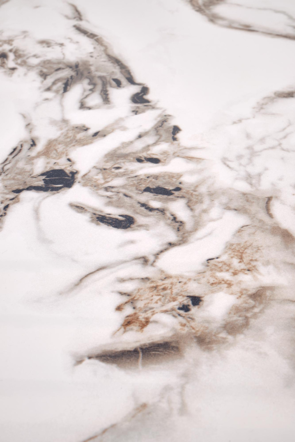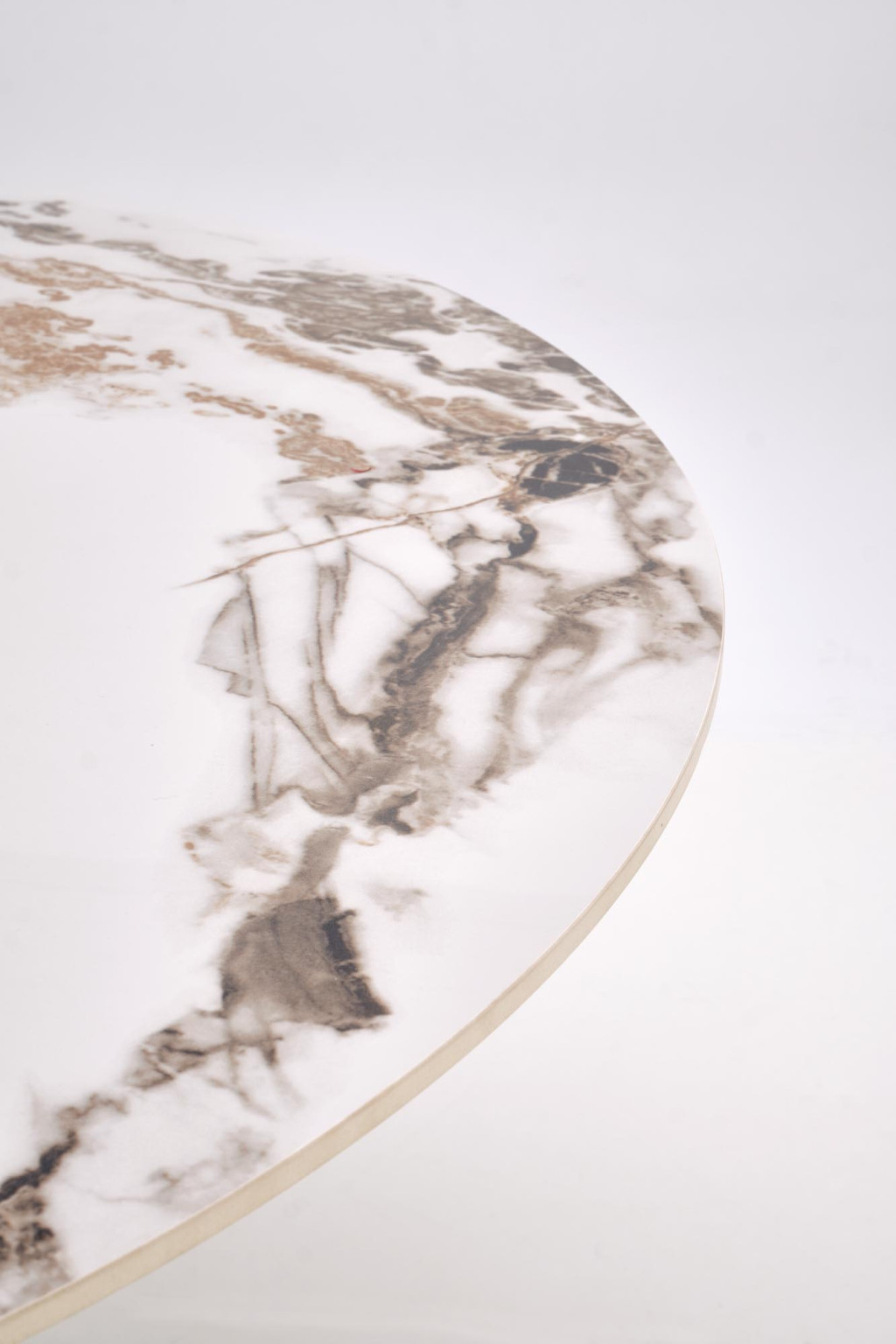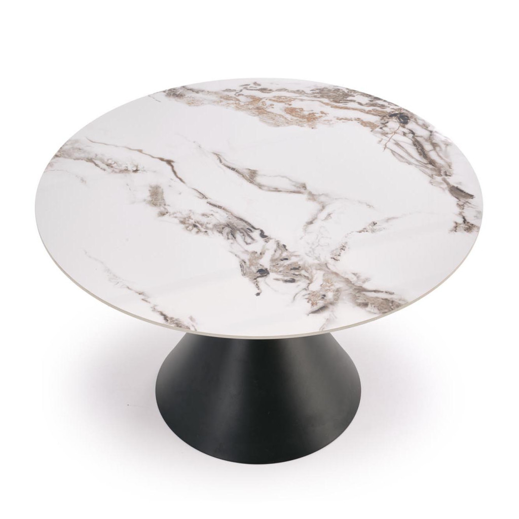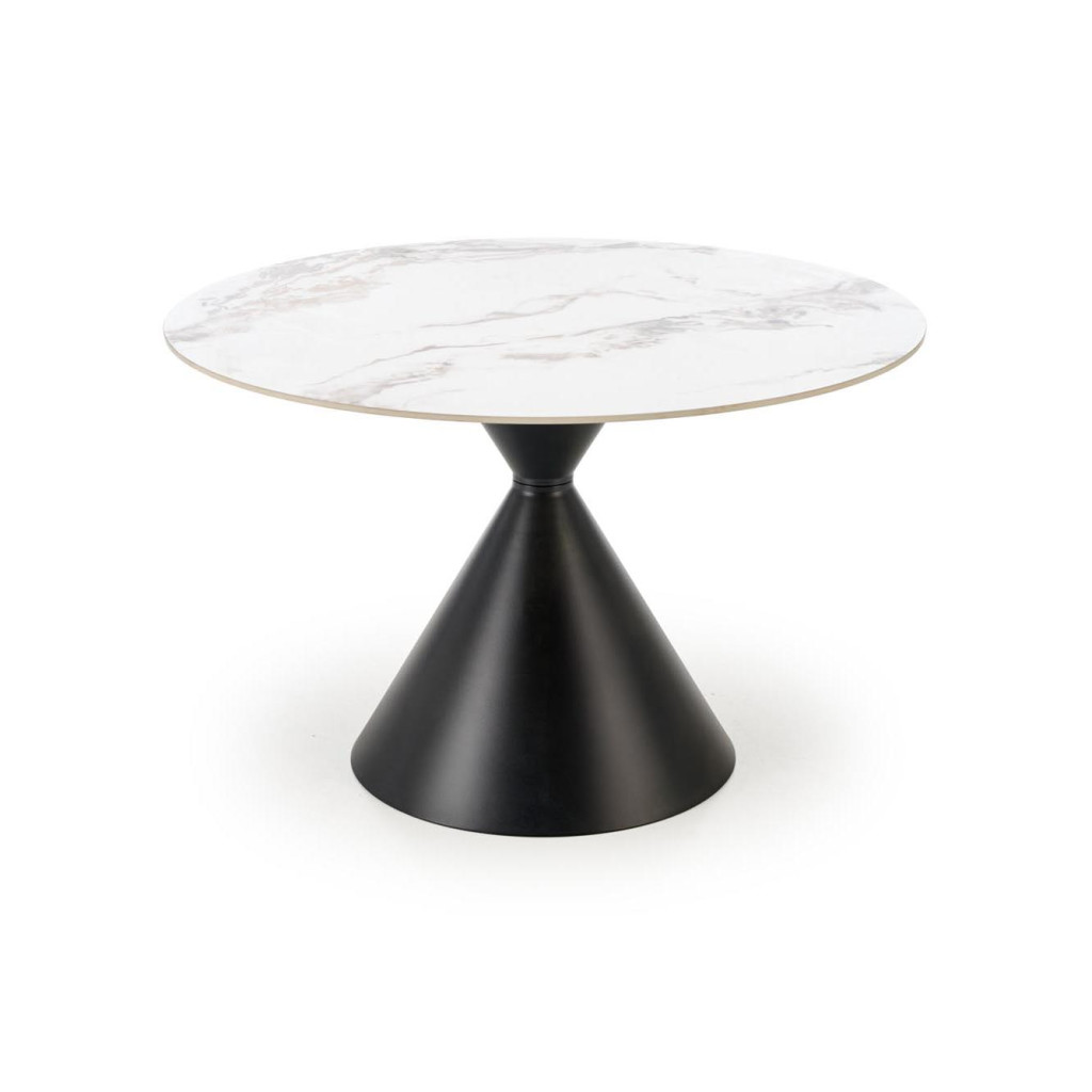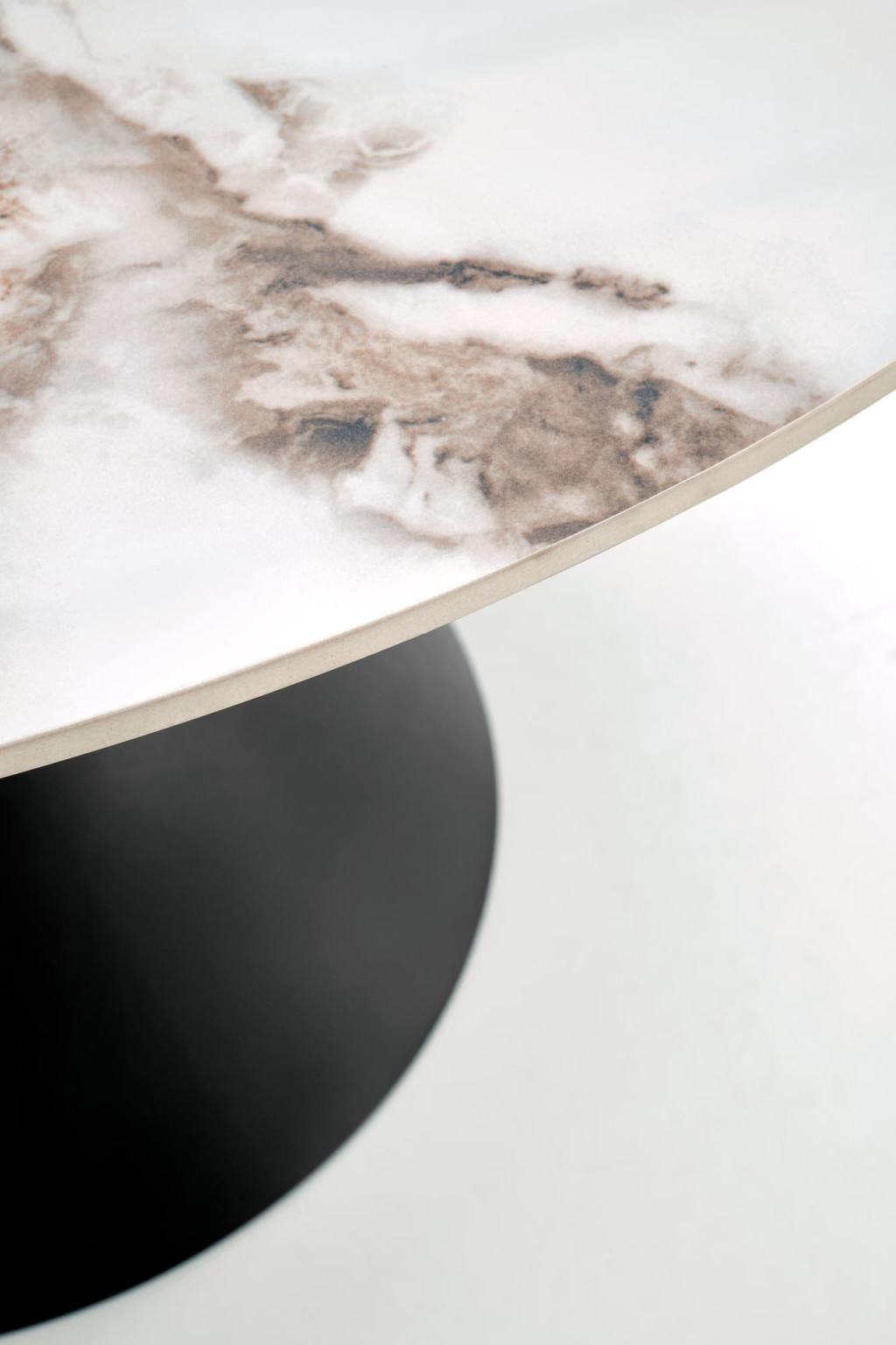 Asztallap : kerek, tartós szinterezett kvarcból készült, fehér márvány felülettel . Karc-, nedvesség- és hőálló, finom márványerezete pedig luxushatást kölcsönöz.  Láb : központi, kúpos ,  fekete porszórt acélból . Stabilitást biztosít, geometriai formája pedig kiemeli az asztal modern jellegét.