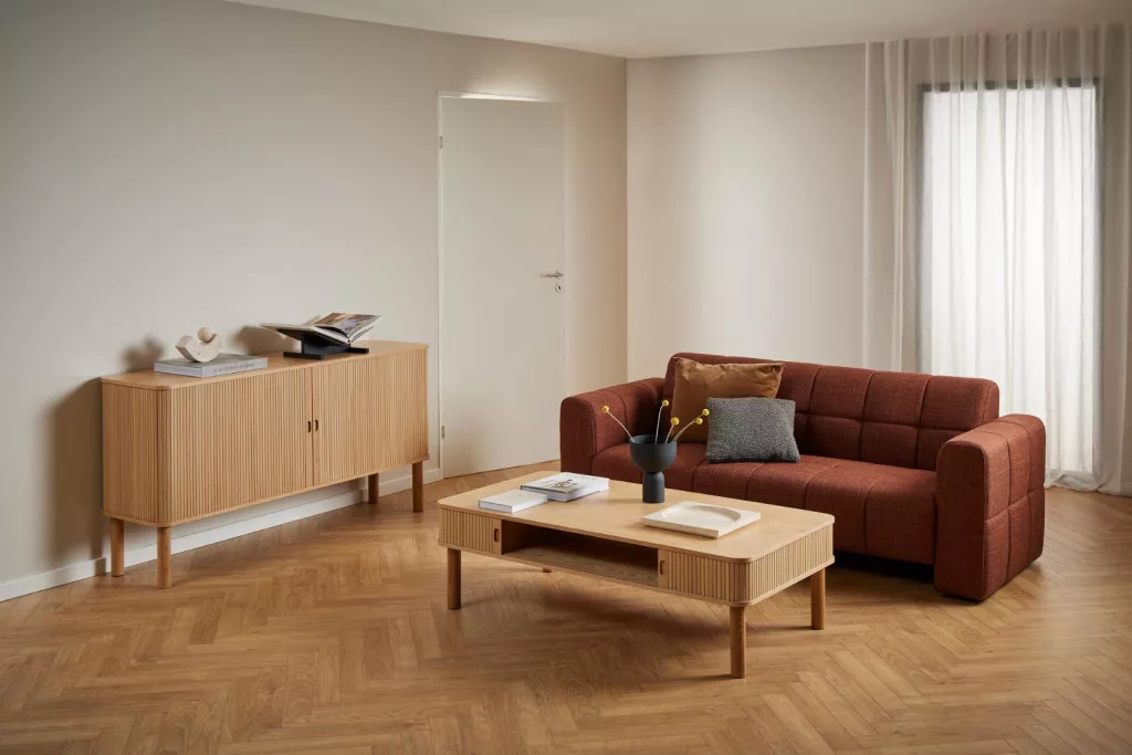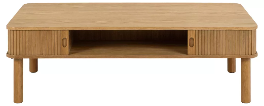 Téglalap alakú, lekerekített sarkokkal rendelkező dohányzóasztal, amely a modern és a rusztikus esztétikát ötvözi, így sokféle belső stílushoz illik. Léces díszítése, lekerekített kontúrjai és lakkozott tölgyfa díszítése jellemzi. Ezenkívül az asztal tolóajtóval és nyitott rekesszel is rendelkezik, amely kényelmes tárolóhelyet biztosít.