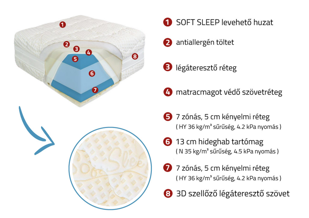 Huzat alatt: SOFT SLEEP levehető huzat, antiallergén töltet, légáteresztő réteg, matracmagot védő szövetréteg, 5 cm kényelmi réteg ( 30 kg/m³ sűrűség, 4.2 kPa nyomás ), 13 cm hideghab tartómag ( 35 kg/m³ sűrűség, 4.5 kPa nyomás, 5 cm kényelmi réteg ( 30 kg/m³ sűrűség, 4.2 kPa nyomás ), 3D szellőző légáteresztő szövet