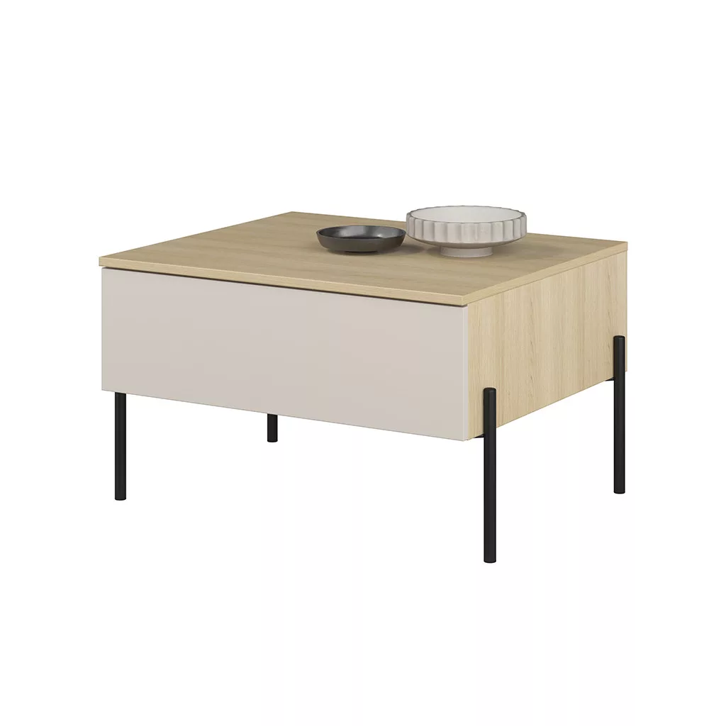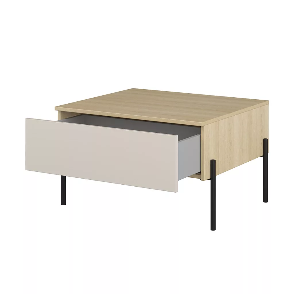 A praktikus fiók ideális tárolóhelyet biztosít a mindennap használt tárgyak – például távirányítók, magazinok vagy apró kiegészítők – számára, így segít rendet tartani a nappaliban. A stabil asztallap elegendő helyet kínál kávé, dekorációk vagy könyvek elhelyezésére.