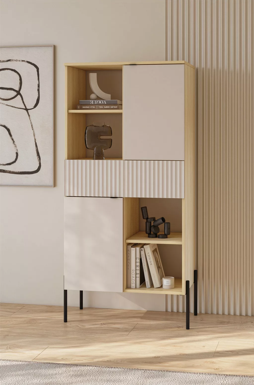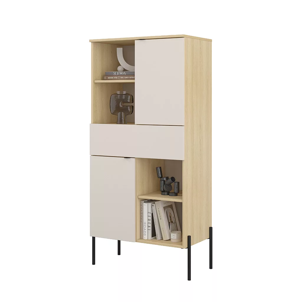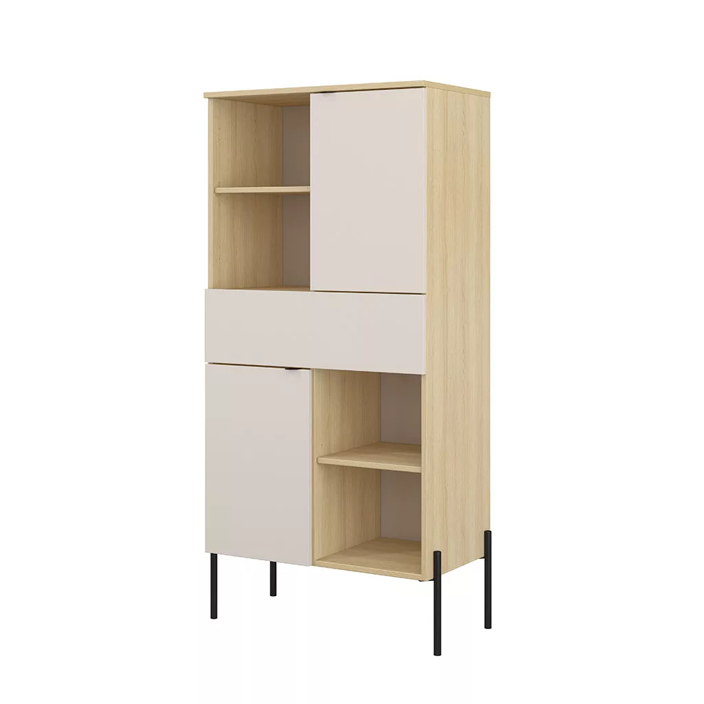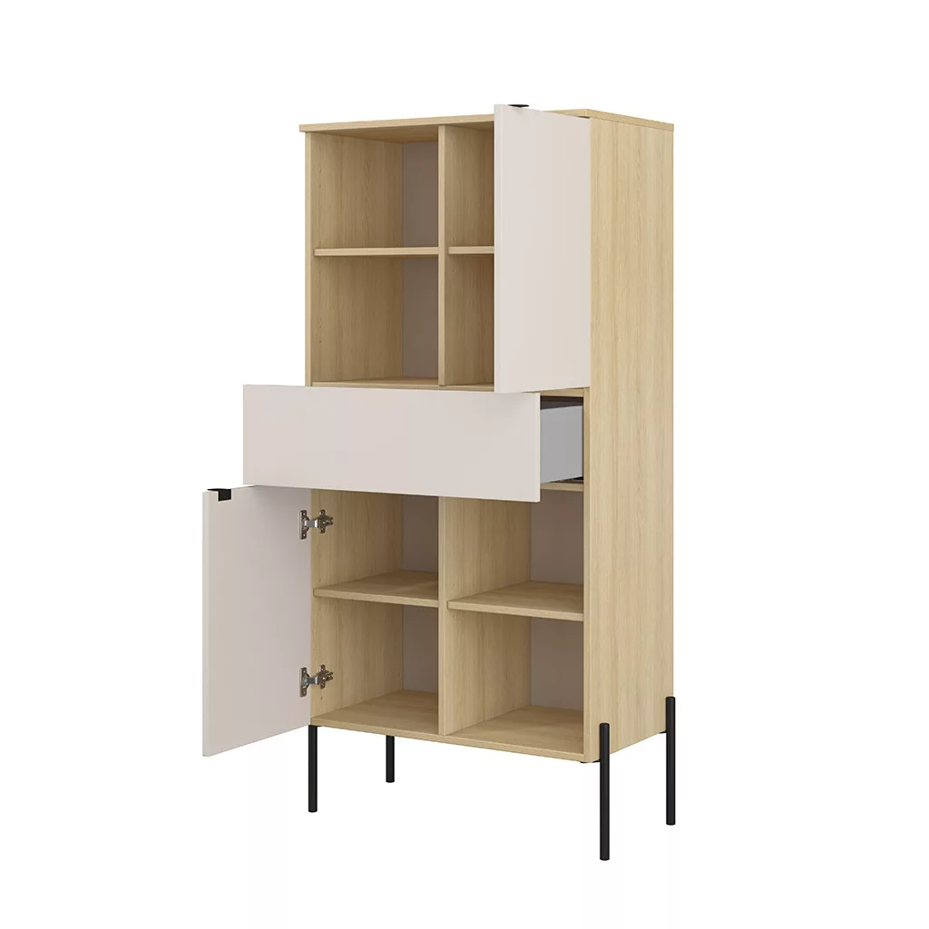 Ez a modern szekrény letisztult formavilágával és elegáns megjelenésével tökéletes választás a nappali, étkező vagy akár az előszoba berendezéséhez. A visszafogott lindberg tölgy szín és kasmír szín egyedi karaktert ad a bútornak, míg a karcsú fekete fém lábak könnyed, kortárs hatást kölcsönöznek.