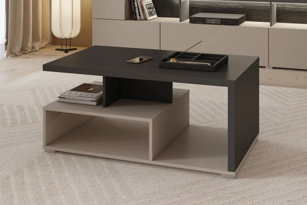 Az asztal több szinten kialakított felületei nemcsak dekoratívak, hanem rendkívül funkcionálisak is. A felső, tágas asztallap ideális helyet biztosít kávé, könyvek vagy dekorációk számára, míg az alsó nyitott rekeszek praktikus tárolóhelyet kínálnak magazinoknak, távirányítóknak vagy egyéb mindennapi tárgyaknak.