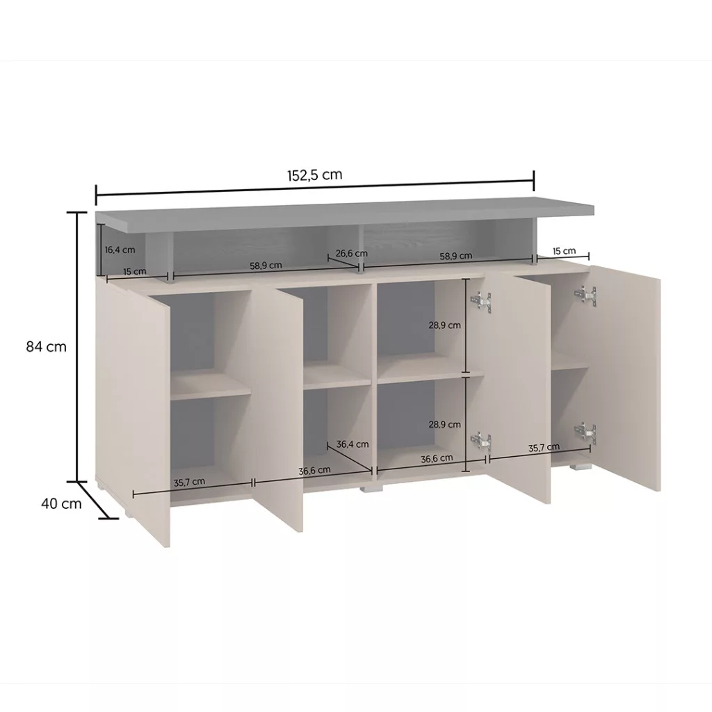 A komód négyajtós kialakítása tágas tárolóhelyet kínál, így praktikus megoldást nyújt különféle használati tárgyak rendszerezésére. A felső nyitott rekeszek ideálisak dekorációk, könyvek vagy kisebb tárgyak elhelyezésére, így a bútor nemcsak funkcionális, hanem dekoratív szerepet is betölt a térben.