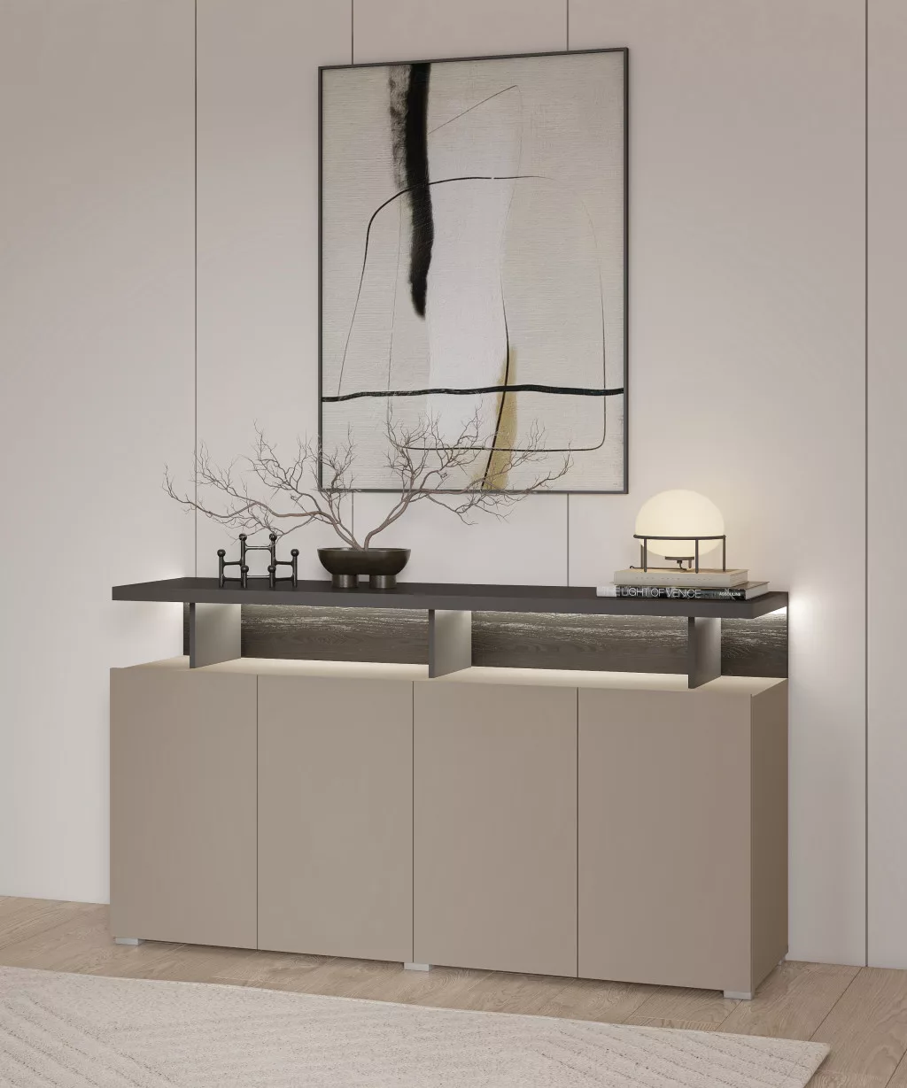 Ez a modern komód letisztult formavilágával és elegáns színkombinációjával stílusos kiegészítője lehet a nappalinak, étkezőnek vagy akár az előszobának is. A homokszínű frontok és a sötétebb felső rész kontrasztja karakteres megjelenést ad a bútornak, miközben könnyedén illeszkedik a mai modern és minimalista enteriőrökbe.