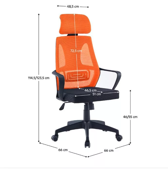 Az irodai szék kivételes eleganciája szinte mindenkit elvarázsol. Fekete és narancssárga hálószövettel kárpitozott, műanyagból készült. A stabilitását a fekete műanyag láb biztosítja. Az ülőrész magassága könnyen állítható a mechanizmussal, mely az ülőrész alatt található. A kartámláknak és a fejtámláknak köszönhetően tökéletes pihenésben lesz része. A TAXIS egy tökéletes társ, mely biztosítja a maximális kényelmet feladatteljesítés közben.
