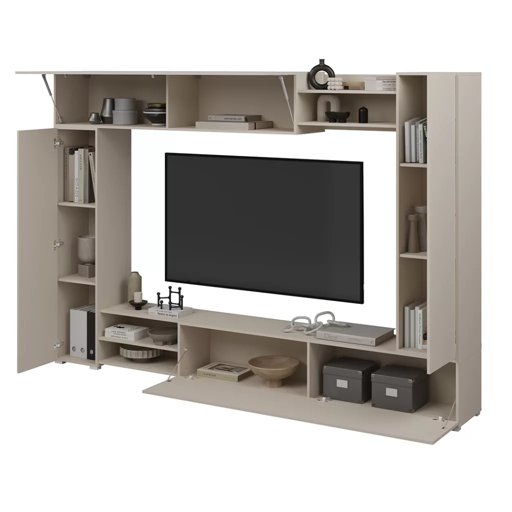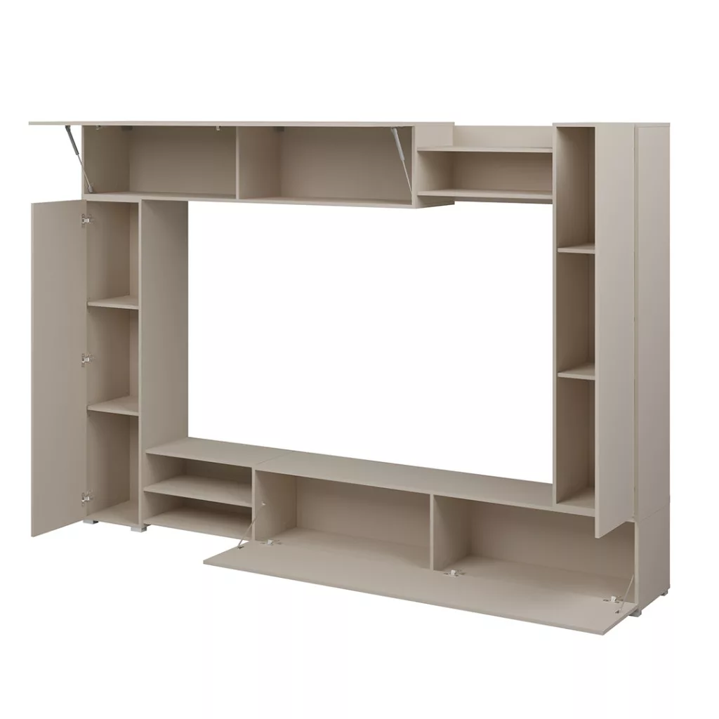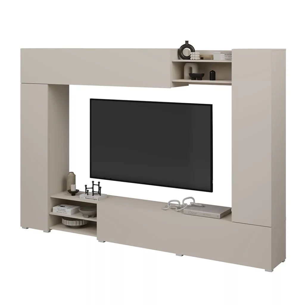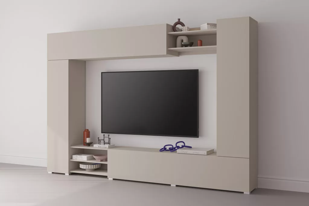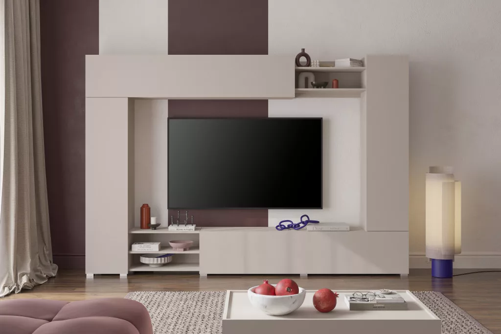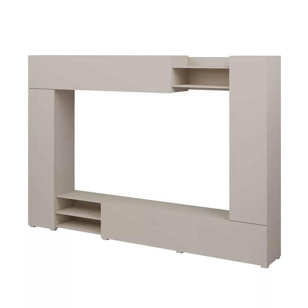 A VERO egy modern, elegáns kasmír árnyalatú nappali szekrény, amely feldobja a belső teret és nyugodt, kiegyensúlyozott megjelenést kölcsönöz neki. Egyszerű formája és jól megtervezett elrendezése a TV-részt zárt szekrényekkel és nyitott polcokkal ötvözi, így könnyen rendszerezhető a nappali.