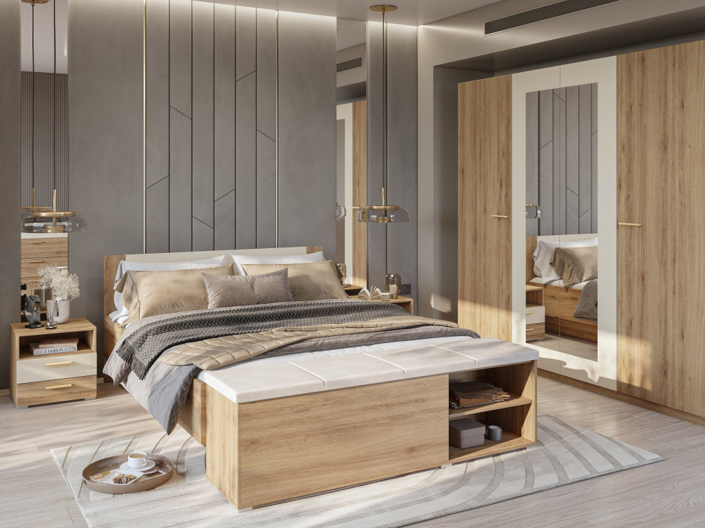 Az elegáns és modern VERTINA hálószoba a vad tölgy természetes szépségét ötvözi a finom homokbézs betétekkel. A kollekció két szélességű ágyat és gardróbot kínál, lehetővé téve az optimális helykihasználást. Egy praktikus fiókos szekrény és funkcionális éjjeliszekrény teszi teljessé az együttest, helyet biztosítva egy éjjeli lámpának, könyveknek vagy más apró tárgyaknak. A kollekció további előnye a kárpitozott ülőfelülettel rendelkező, tárolóhelyes pad. Ez nemcsak elegáns díszítőelem, hanem praktikus megoldás is, kényelmes ülőhelyet kínálva.