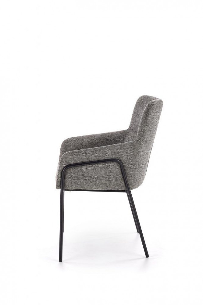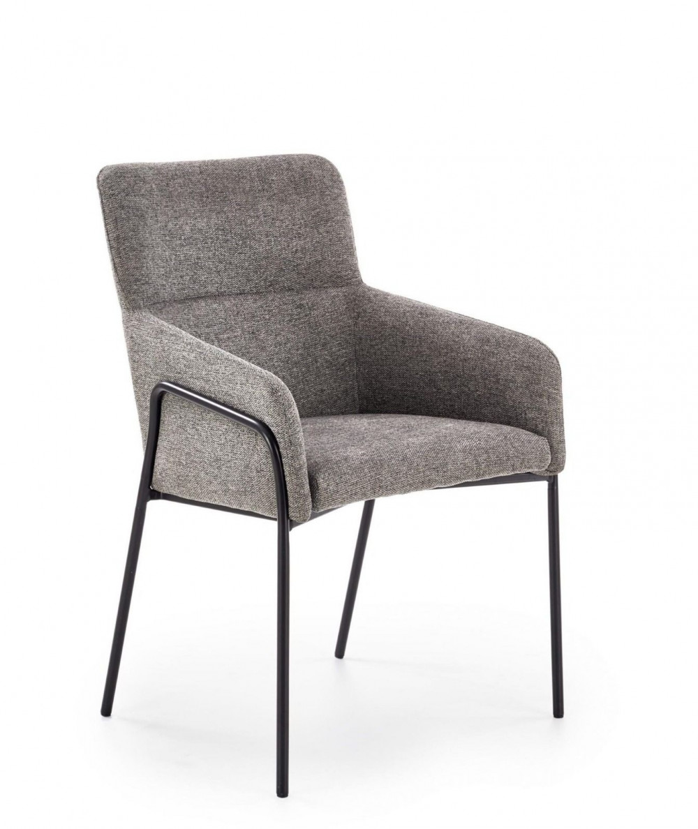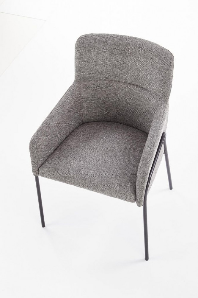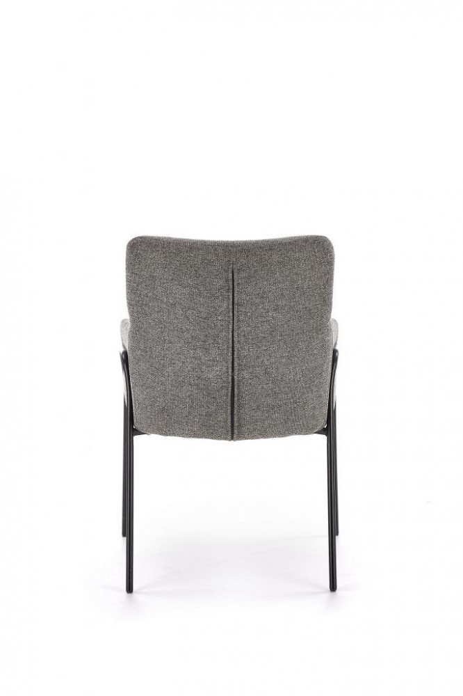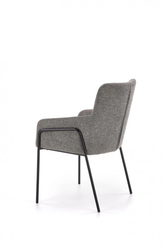 Kényelmes, modern étkezőszék, szürke szövetkárpitozással. Lábai fekete, porszórt acélból készülnek.