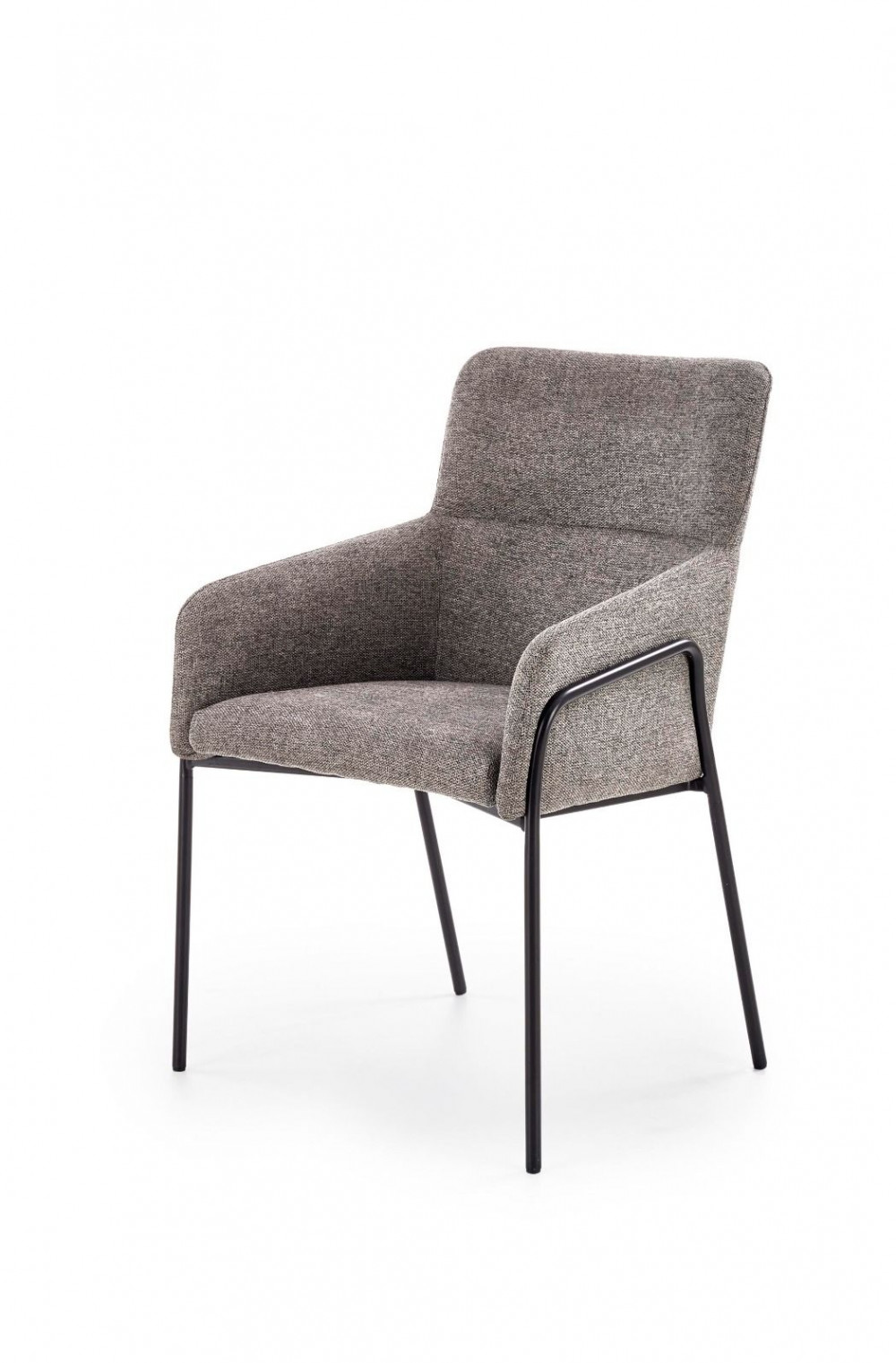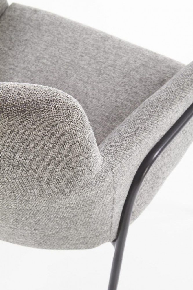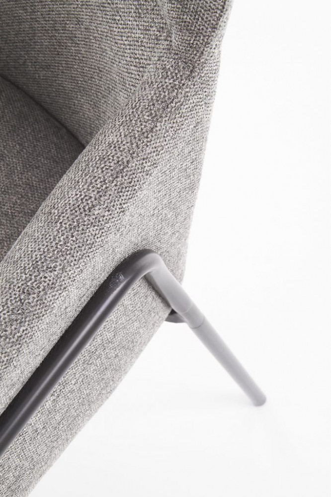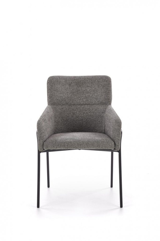 Kényelmes, modern étkezőszék, szürke szövetkárpitozással. Lábai fekete, porszórt acélból készülnek.