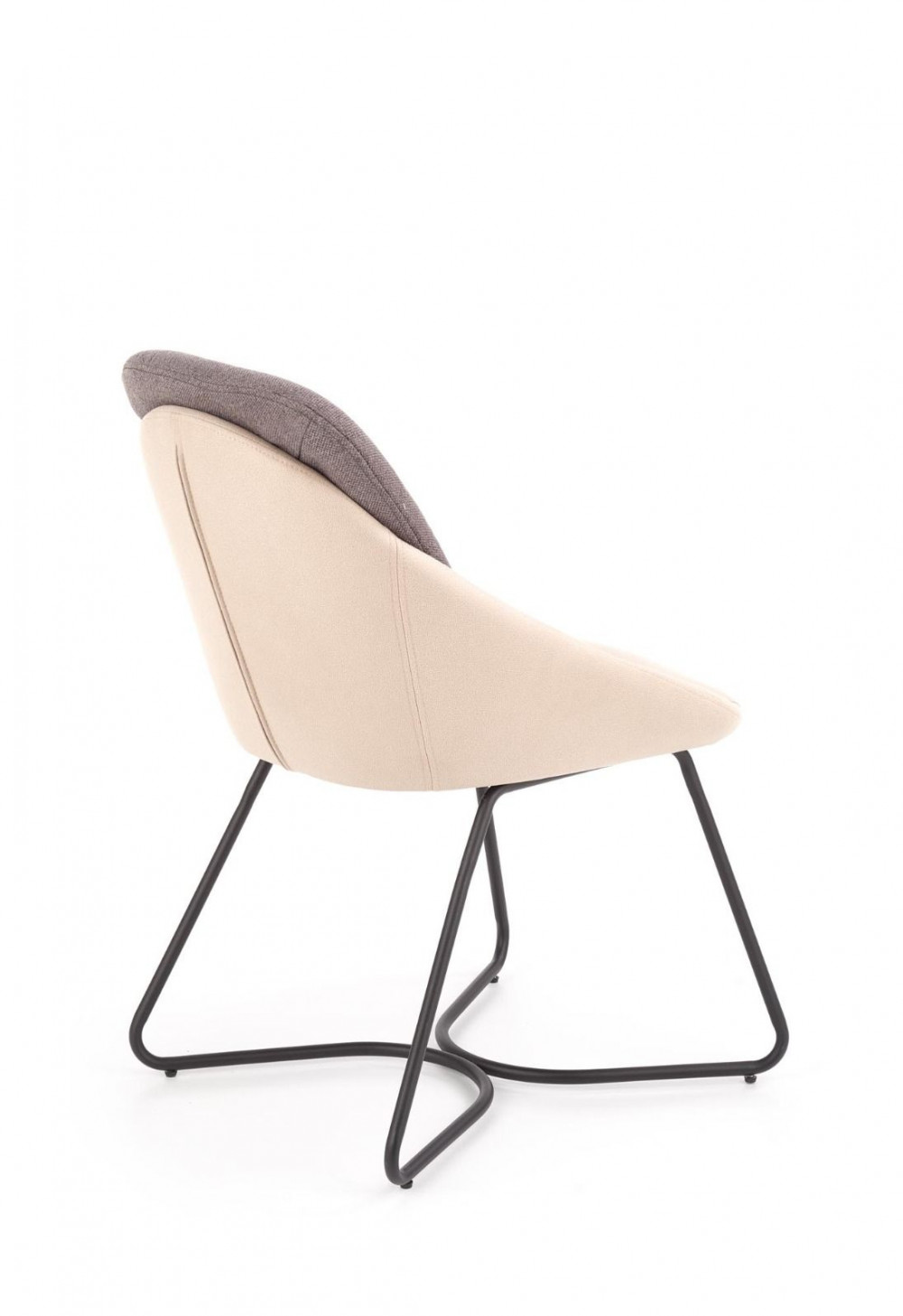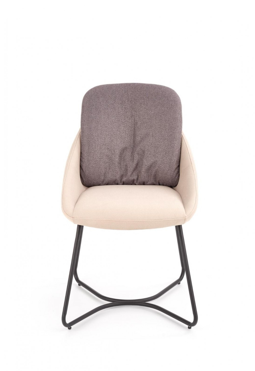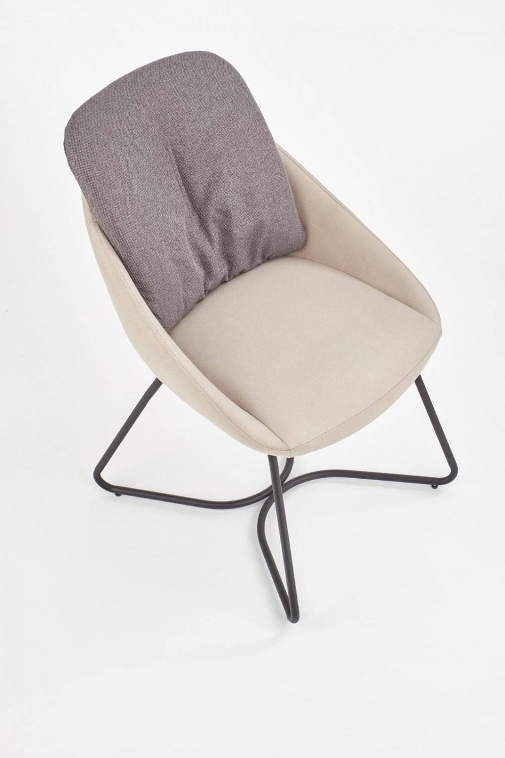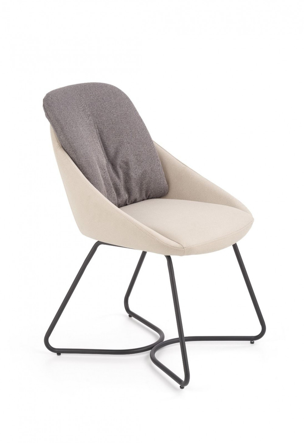 Modern, párnázott étkezőszék, bézs-világosszürke hatású kárpitozással és sötétszürke párnával. Dizájnos formájú lábai fekete, porszórt acélból készülnek.
