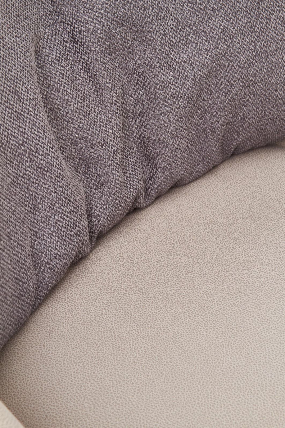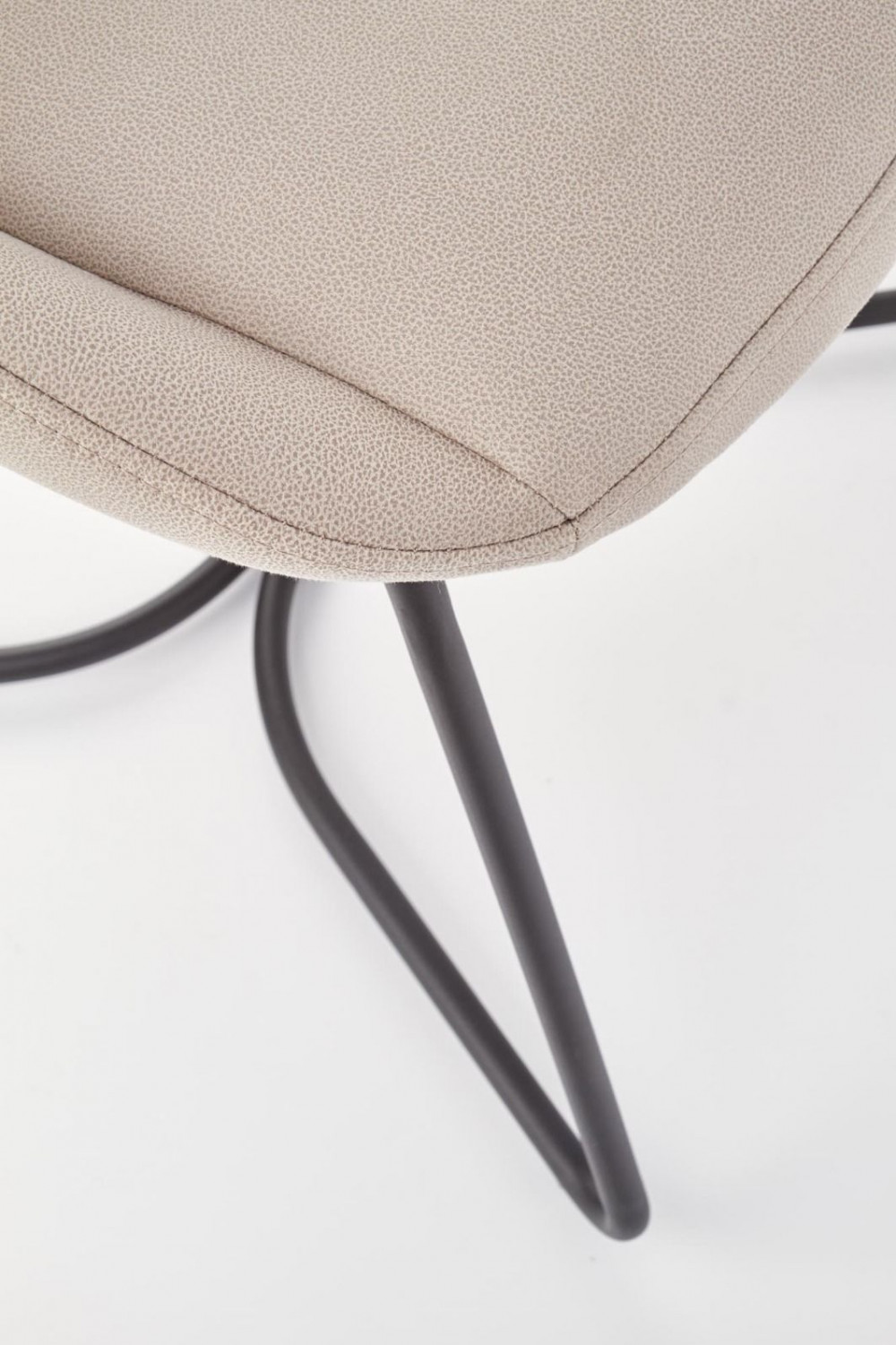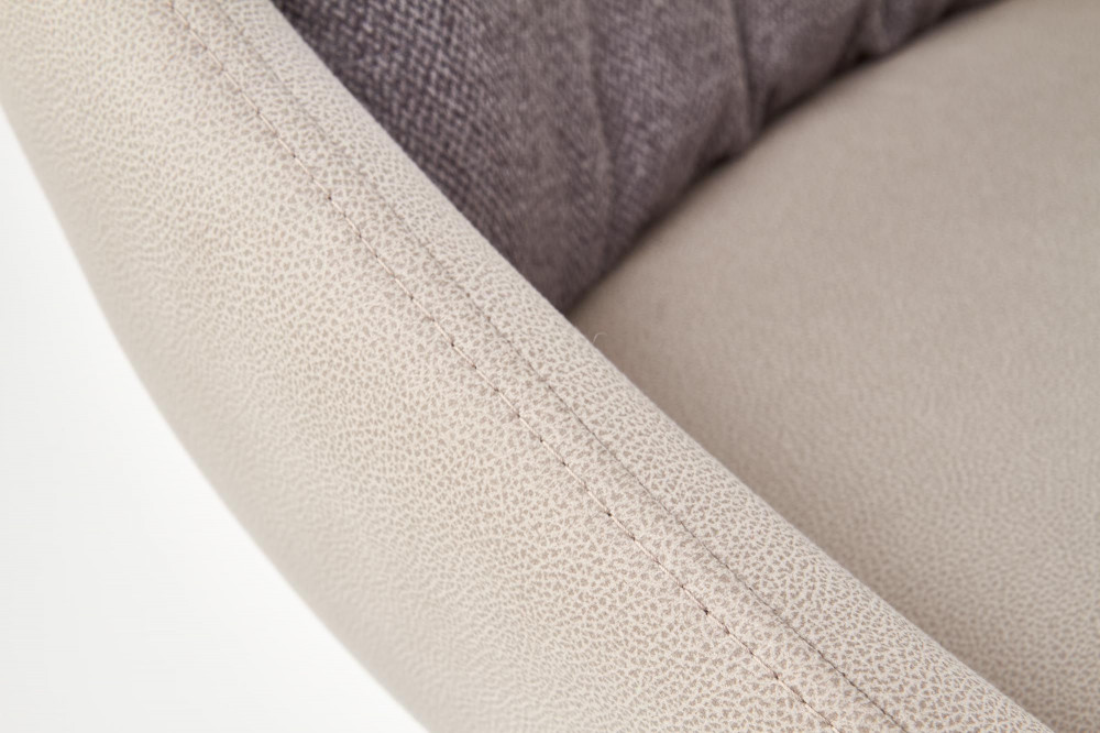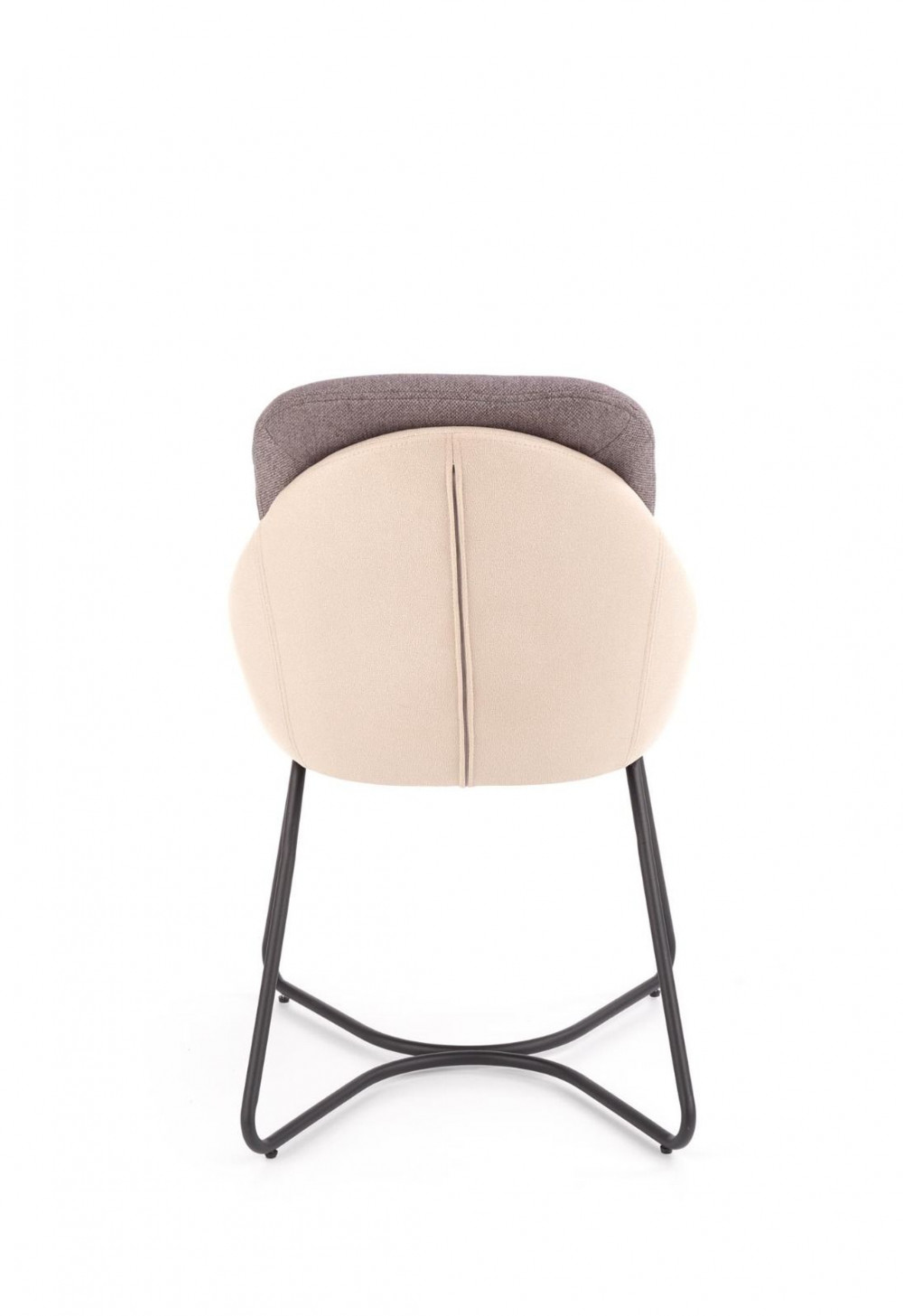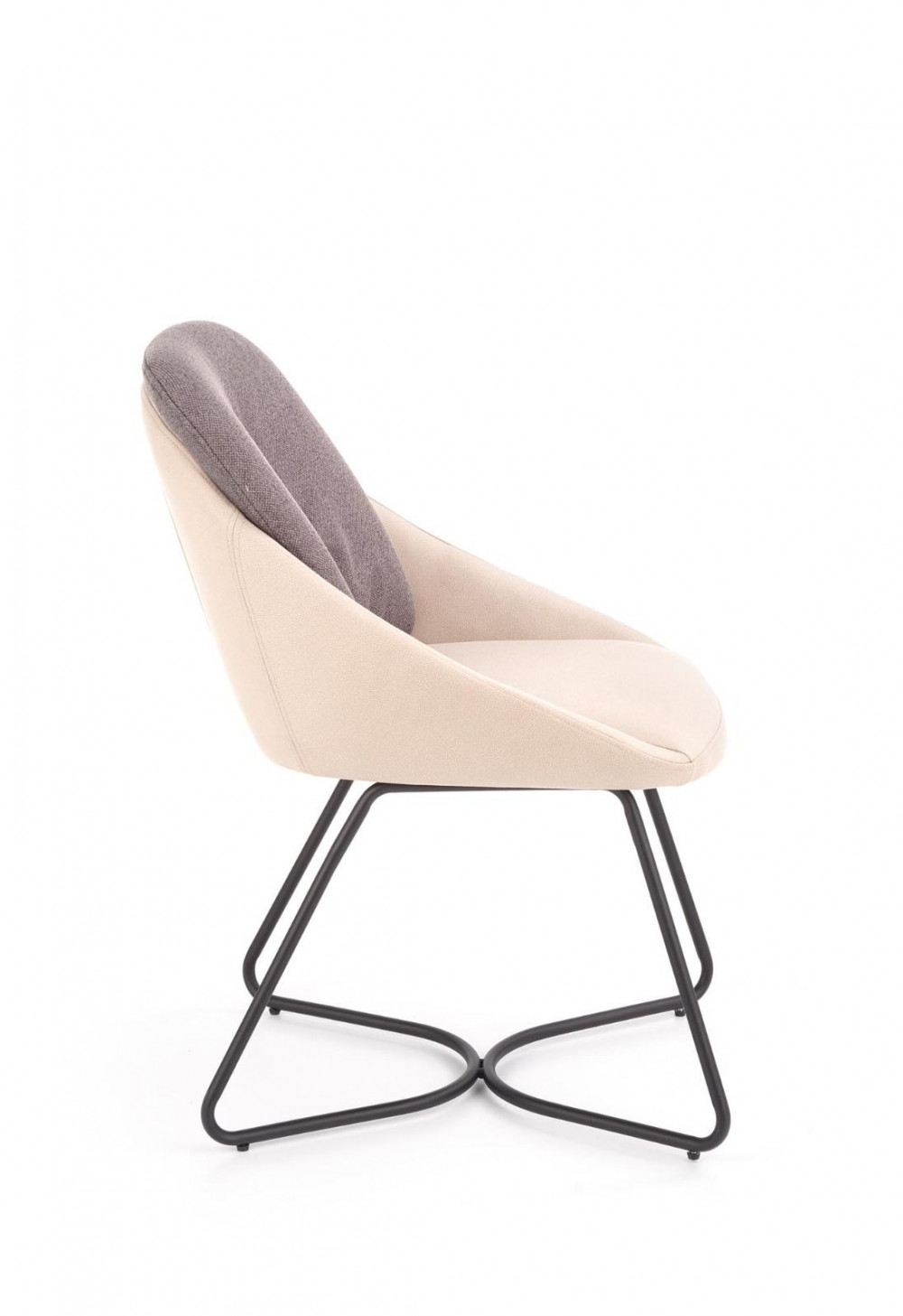 Modern, párnázott étkezőszék, bézs-világosszürke hatású kárpitozással és sötétszürke párnával. Dizájnos formájú lábai fekete, porszórt acélból készülnek.