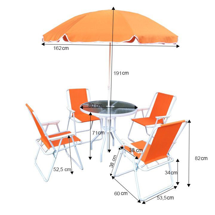 Az ODELO kerti bútor szett  mindent tartalmaz ami a kerti pihenéshez kell. A készletben található négy darab összecsukható szék, egy üveglapú kerek asztal és egy napernyő ami elengedhetetlen a nagy hőségben. Minőségi időjárás álló anyagokból készül mint például a poliészterszövet, fém és üveg. Vidám narancssárga és fehér színei feldobják a környezetet.