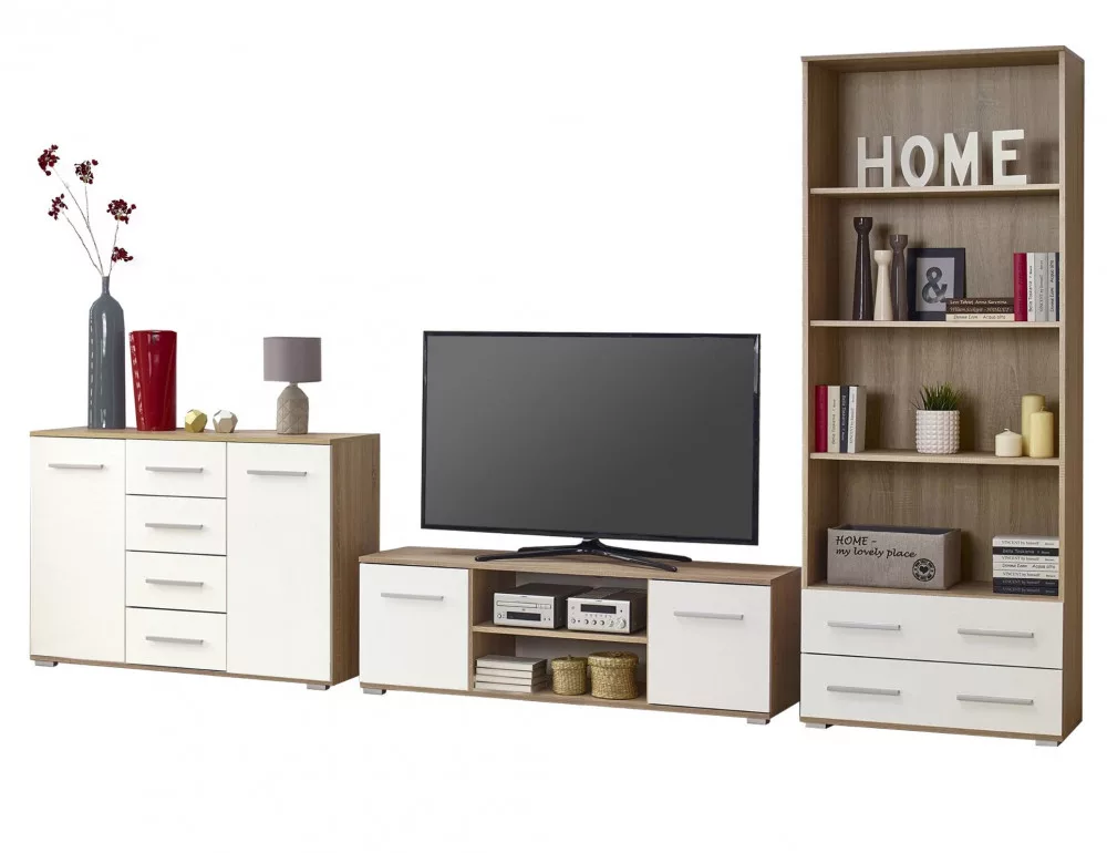 Modern nappalibútor-összeállítás, amely minden enteriőrbe könnyedén illeszkedik. Sonoma tölgy színű váz és magasfényű fehér frontok. Laminált forgácslapból készült. A bútorcsalád további termékei megtalálhatóak webshopunkban (lejjebb görgetve a kapcsolódó termékek résznél).