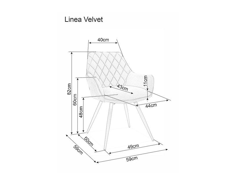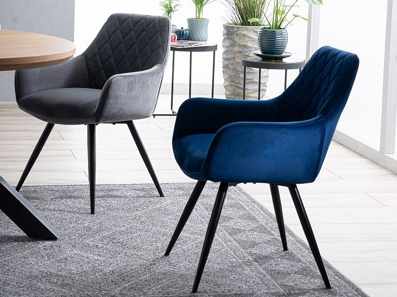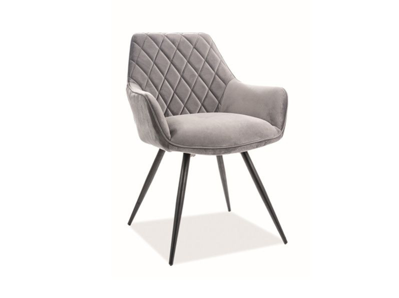 Elegáns étkezőszék bársonyhatású szövetkárpitozással, fix karfával és fekete fémlábakkal. Háttámlájának rombuszmintás varrása egyediséget és stílusosságot ad a bútornak. Nagy színválasztékban rendelhető.