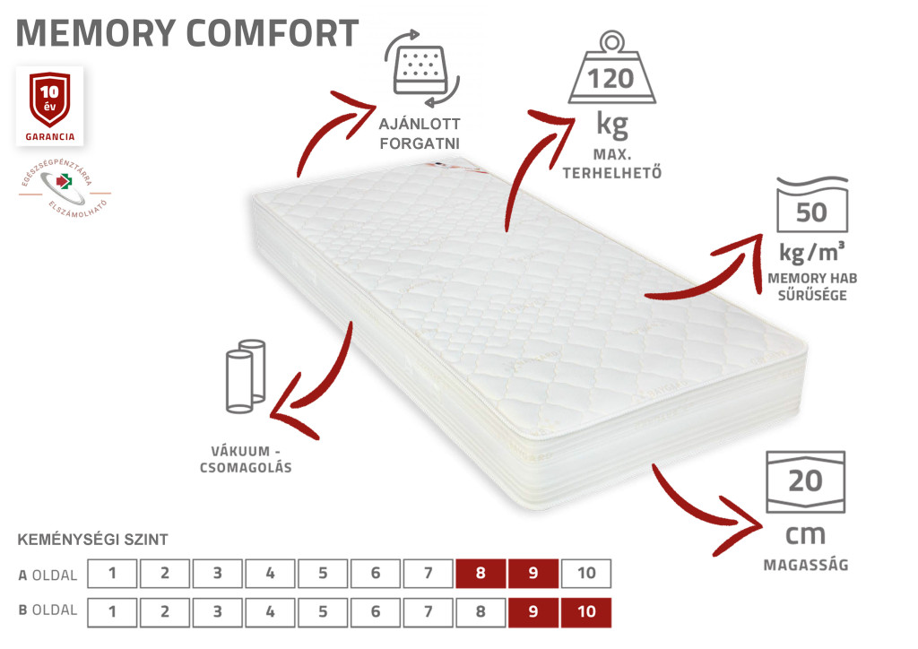 A Memory Comfort matrac belsejében lévő hideghab rugalmassága révén, valamint a huzatanyaghoz steppelt memory habnak köszönhetően az emberi test alakjához idomul, ezáltal jobb vérkeringést ad, elősegíti az izmok pihenését a testünk minden részében és nyugodt, pihentető alvást tesz lehetővé.
