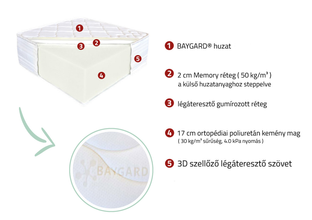 Huzat alatt: BAYGARD huzat, 2 cm Memory réteg (50 kg/m3) a külső huzatanyaghoz steppelve, légáteresztő gumírozott réteg, 17 cm ortopédiai poliuretán kemény mag (30 kg/m3 sűrűség, 4.0 kPa nyomás), 3D szellőző légáteresztő szövet