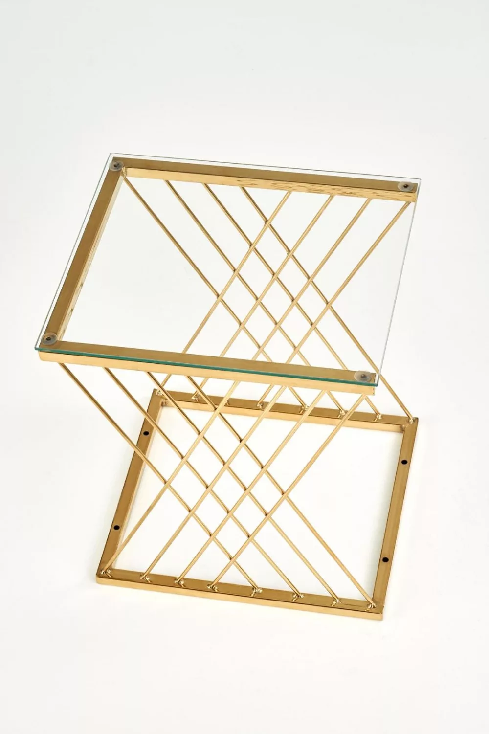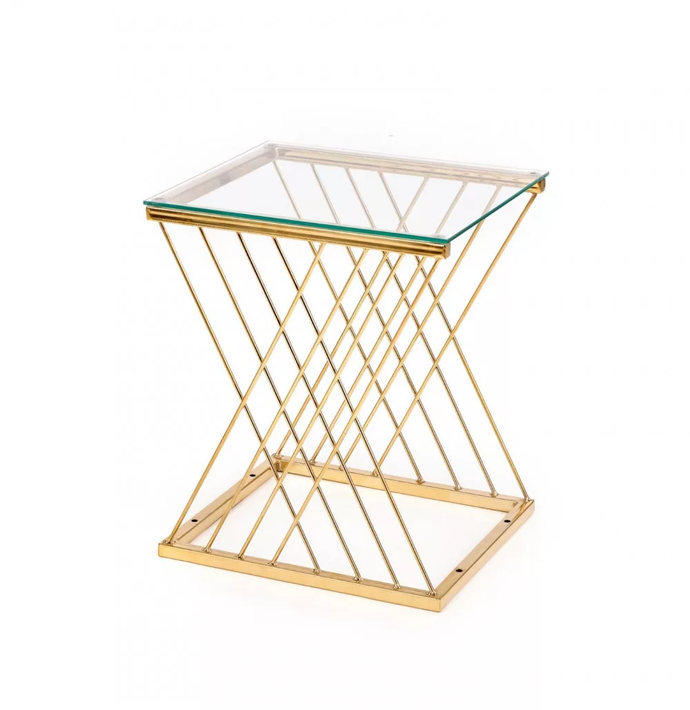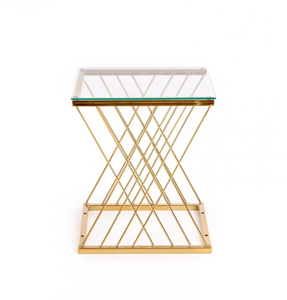 Elegéns dohányzóasztal üveg asztallappal, formabontó, arany színű krómacél lábakon.