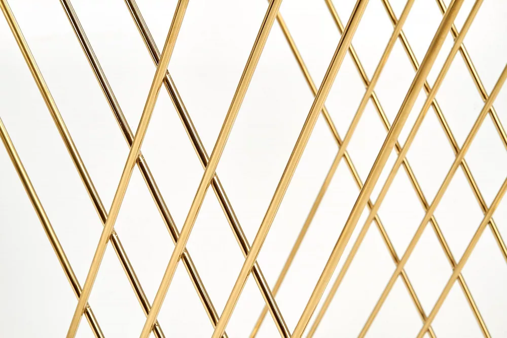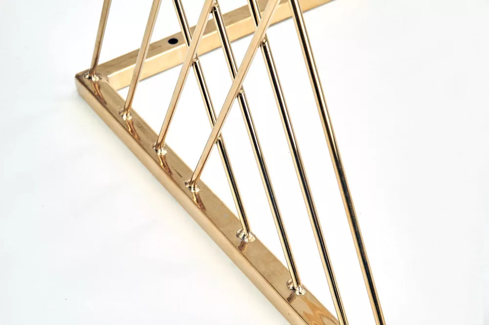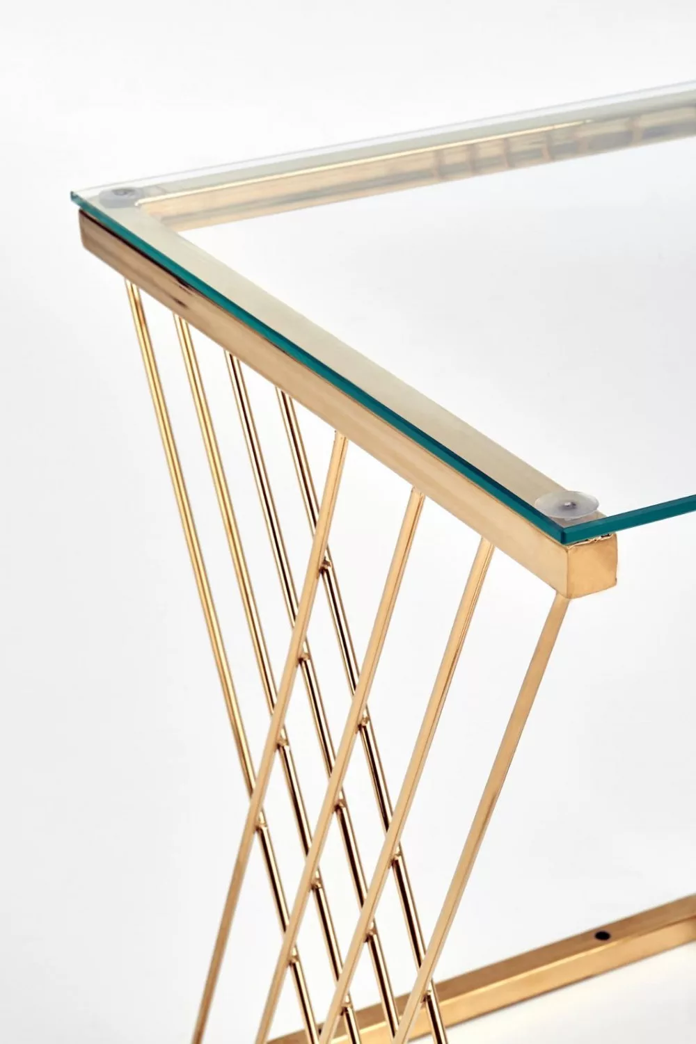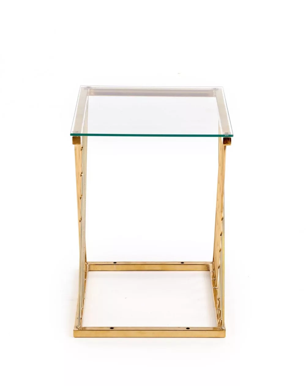 Elegéns dohányzóasztal üveg asztallappal, formabontó, arany színű krómacél lábakon.