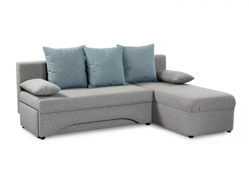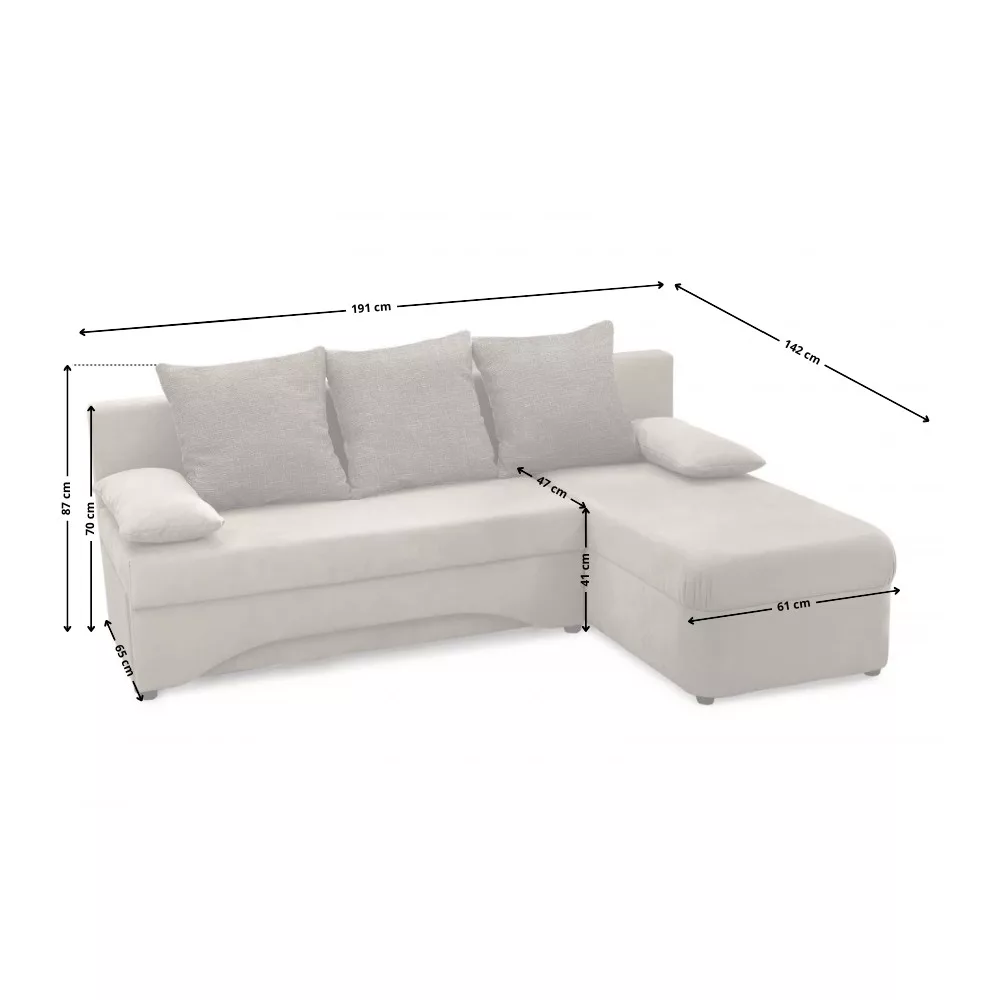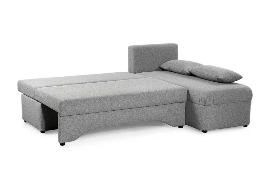 Kompakt méretű sarokkanapé vendégágy funkcióval. A poliéter habkárpit biztosítja a kényelmet. A kihúzható részben található beépített ágyneműtartó elegendő tárolóhelyet biztosít. Az ár 3 hátsó párnát és 2 kartámasz párnát is tartalmazza. A háttámla is a bútor anyagával van beborítva, így akár térben is elhelyezhető. Ez az üllőgarnitúra univerzális, tehát balos és jobbos állásban is össze szerelhető.