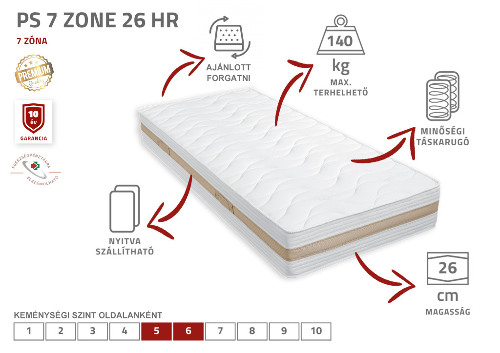 A PS 7 ZONE 26 HR matrac egy prémium minőségű, közepesen kemény, nagy teherbírású, formakövető és antiallergén matrac. A matrac belsejében található 7 zónás zsákrugós rendszer a huzalvastagság (1,8–2,0 mm) és a rugókban lévő menetközök precíz kialakításának köszönhetően biztosít zónás alátámasztást. A zsákrugók felett egy 36 kg/m³ sűrűségű, komfortos HYBRID hideghabréteg helyezkedik el, amely tökéletesen felveszi a test vonalát, így egészséges és pihentető alvási élményt nyújt. A matracot 255 rugó/m² sűrűségű rugózat alkotja, amely biztosítja a megfelelő tartást. A BAYGARD® antiallergén huzat kiváló légáteresztő képességgel rendelkezik, amit az oldalsó 3D szellőzőcsík tovább fokoz. A matrac stabil tartást ad ott, ahol szükséges, és nem érezhető benne áthullámzás – így alvópartnerünket sem zavarja az éjszakai mozgás.