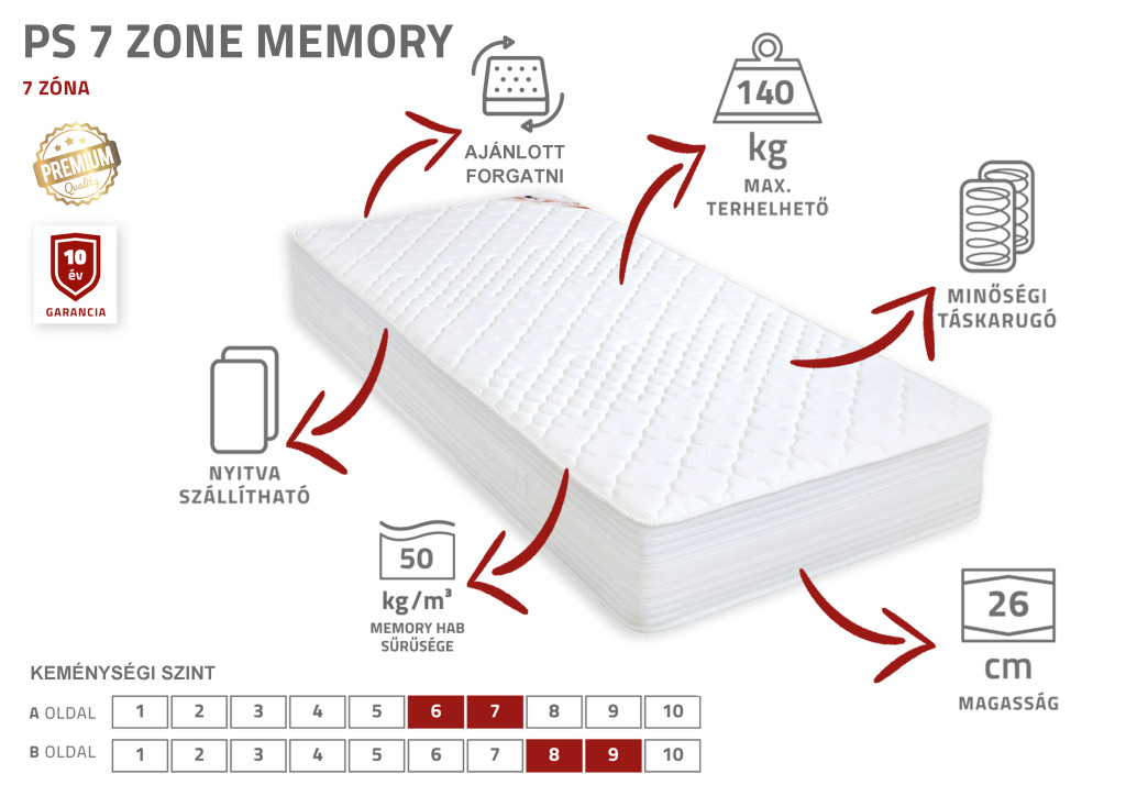 PS 7 ZONE Memory olyan prémium kategóriás zsákrugós – memory matrac mely a 7 zónának köszönhetően tökéletesen alkalmazkodik a test formájához. Azoknak az embereknek ajánljuk, akik szeretik a lágyabb – komfortosabb fekvéshatást. Ez a 26 cm magas kiemelkedően nagy komfort igényű matrac 10 év garanciával a legjobb választás a félkemény ágybetétet kedvelőknek.