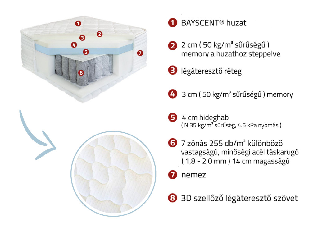A huzat alatt: BAYSCENT® huzat, 2 cm ( 50 kg/m³ sűrűségű ) memory a huzathoz steppelve, légáteresztő réteg, 3 cm ( 50 kg/m³ sűrűségű ) memory, 4 cm hideghab ( N 35 kg/m³ sűrűség, 4.5 kPa nyomás ), 7 zónás 255 db/m² különböző vastagságú, minőségi acél táskarugó ( 1,8 – 2,0 mm ) 14 cm magasságú, nemez, 3D szellőző légáteresztő szövet