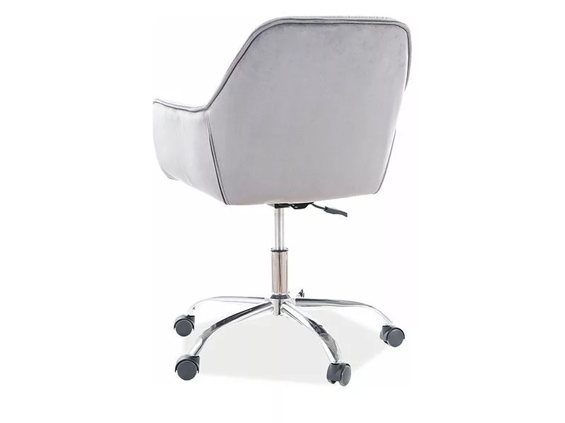 Bársonyos forgószék szürke kárpitozással. Egyedülálló kategóriájában, extra kényelmes kialakítás. Krómozott csillaglábain műanyag kerekekkel, melyek nem karcolják a padlót. Ülésmagassága állítható.