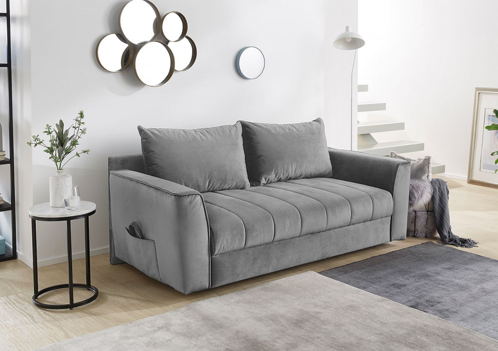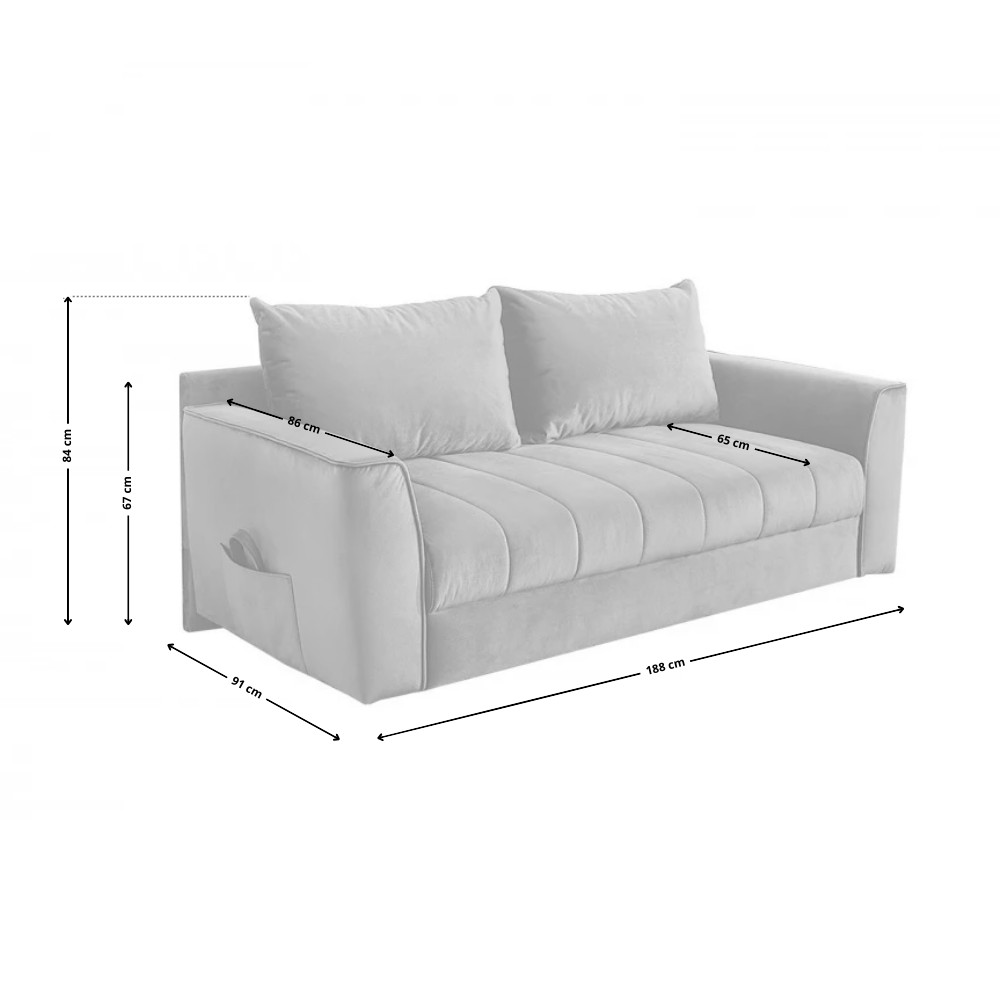 Praktikus kanapéágy többféle színben, ágyneműtartóval. Egyik oldalát lehajtva 81x199 cm-es fekvőfelület alakítható ki. Karfájában egy újságtartó zseb található. A két párna a szett tartozéka. Hátulja nem kárpitozott, így elsősorban falfelület elé helyezve ajánljuk.