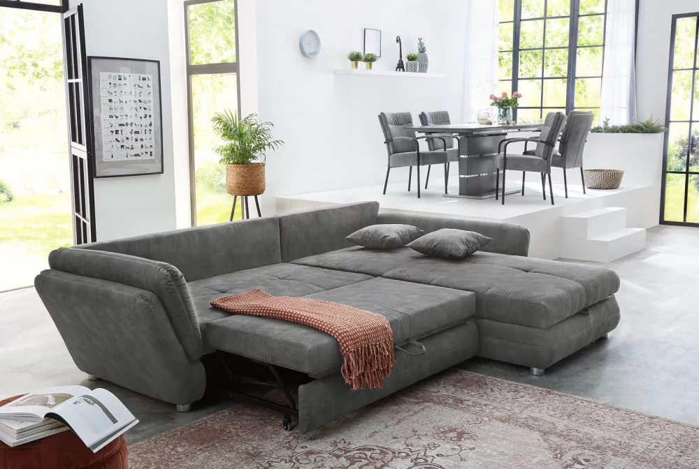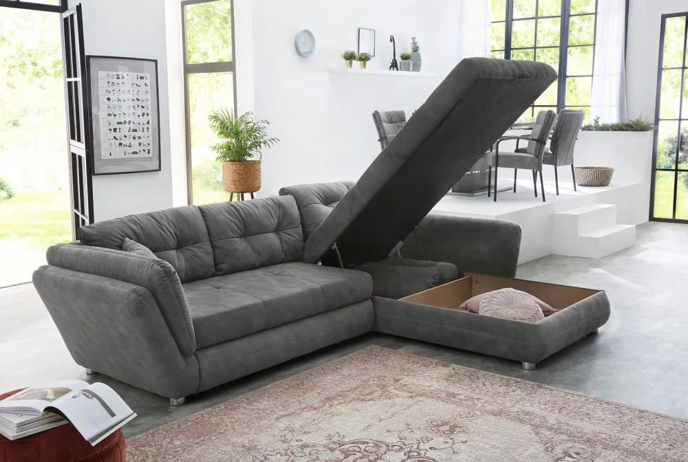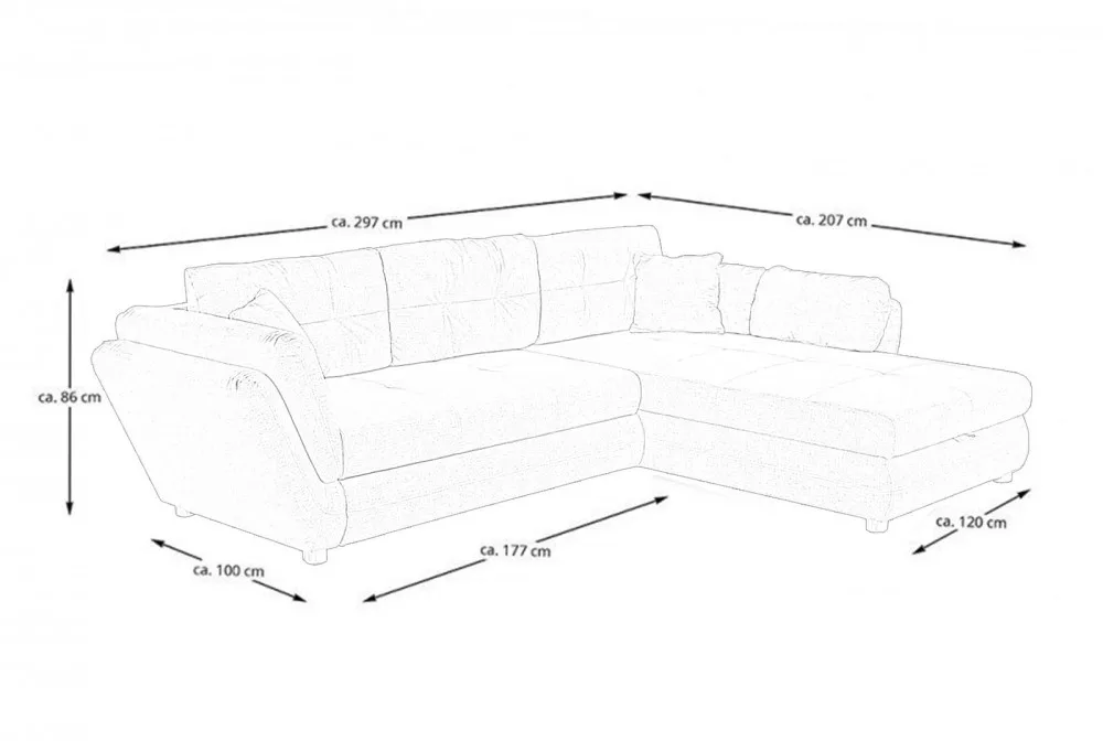 Praktikus & modern nappali sarokkanapé-összeállítás, amely összeszerelhető balos vagy jobbos kivitelben is. Többféle színben rendelhető, dekoros steppeléssel, mikroszálas, 100% pamutkárpitozással. A Nosag rugózat és a poliéter habszivacs gondoskodik az ülőkomfortról. Kihúzható, vendégágy funkcióval valamint ágyneműtartóval is felszerelt. A kanapé hátulja is anyaggal borított. A képeken látható párnák a garnitúra részei: 3 nagyméretű hátpárna, 2 közepes méretű illetve 2 kisebb díszpárna.